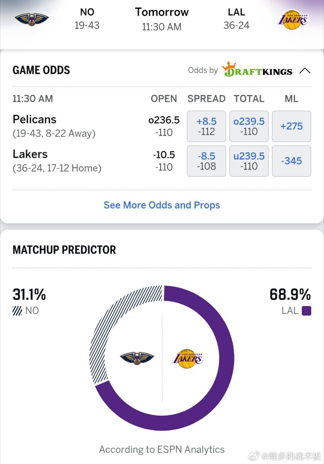 ESPN预测明日鹈鹕vs湖人胜率: 鹈鹕31.1%,湖人68.9%,比赛时间中午11点半⏰