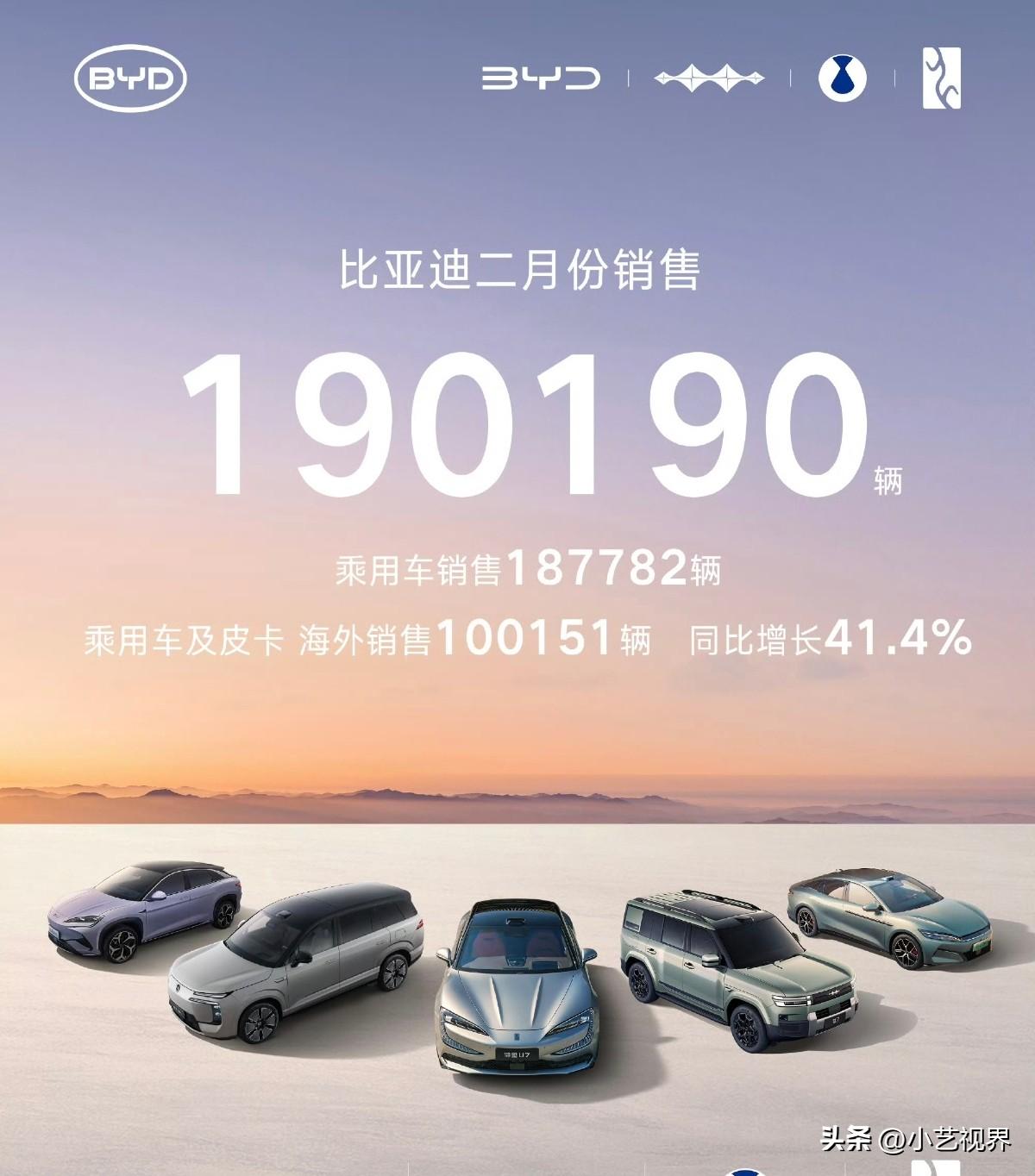 2月销售超19万辆,比亚迪稳坐新能源销量冠军! 因为春节因素,2月国内汽车市场消费节奏阶段性放缓,但比亚迪汽车的整体表现却依旧稳健,以190190辆的销量成绩再度稳居新能源销量冠军! 作为新能源汽车行业的引领者,比亚迪从2021年6月至今,已经连续57个月稳居中国新能源汽车销量榜首。2025年12月第1500万辆新能源汽车线下,截止目前累计销量已超1550万辆。 在王朝|海洋系列稳固规模优势的前提下,比亚迪海外及高端品牌销量表现亮眼。2月海外销量达100151辆,1-2月累计销售200160辆;方程豹、腾势、仰望三大高端品牌2月合计销售2.3万辆。 比亚迪在春节销售淡季表现依然稳健,侧面反应了头部品牌车企的硬实力与品牌影响力。与此同时,3月5日比亚迪将举行颠覆性的技术发布会,市场反馈强烈,A股当日上涨8.36%。 2025年,比亚迪年销量460万辆,连续多年蝉联新能源汽车销量冠军。进入2026年,比亚迪在规模、技术与全球市场的三重优势的支撑下,将会加速全球布局,持续领跑新能源汽车市场。