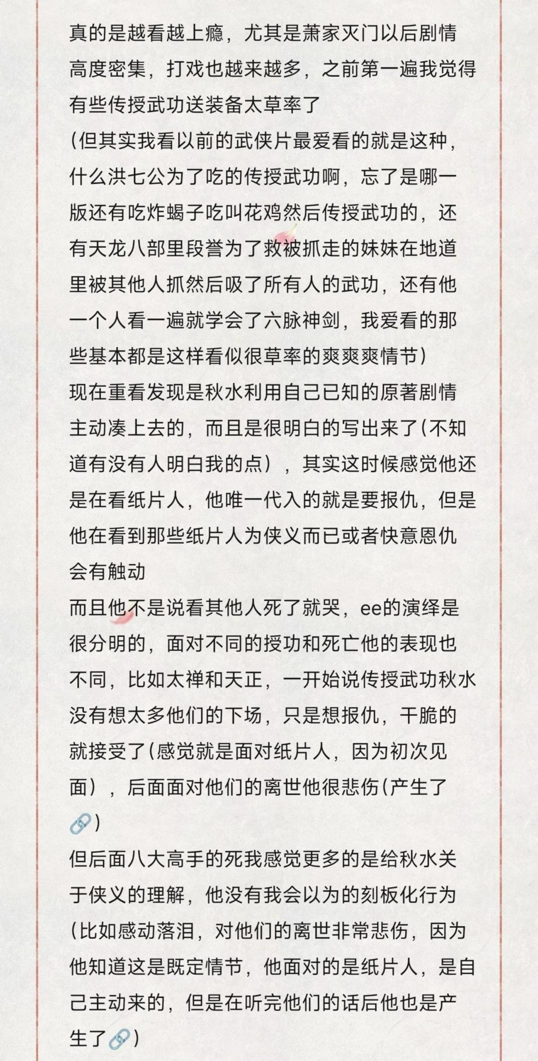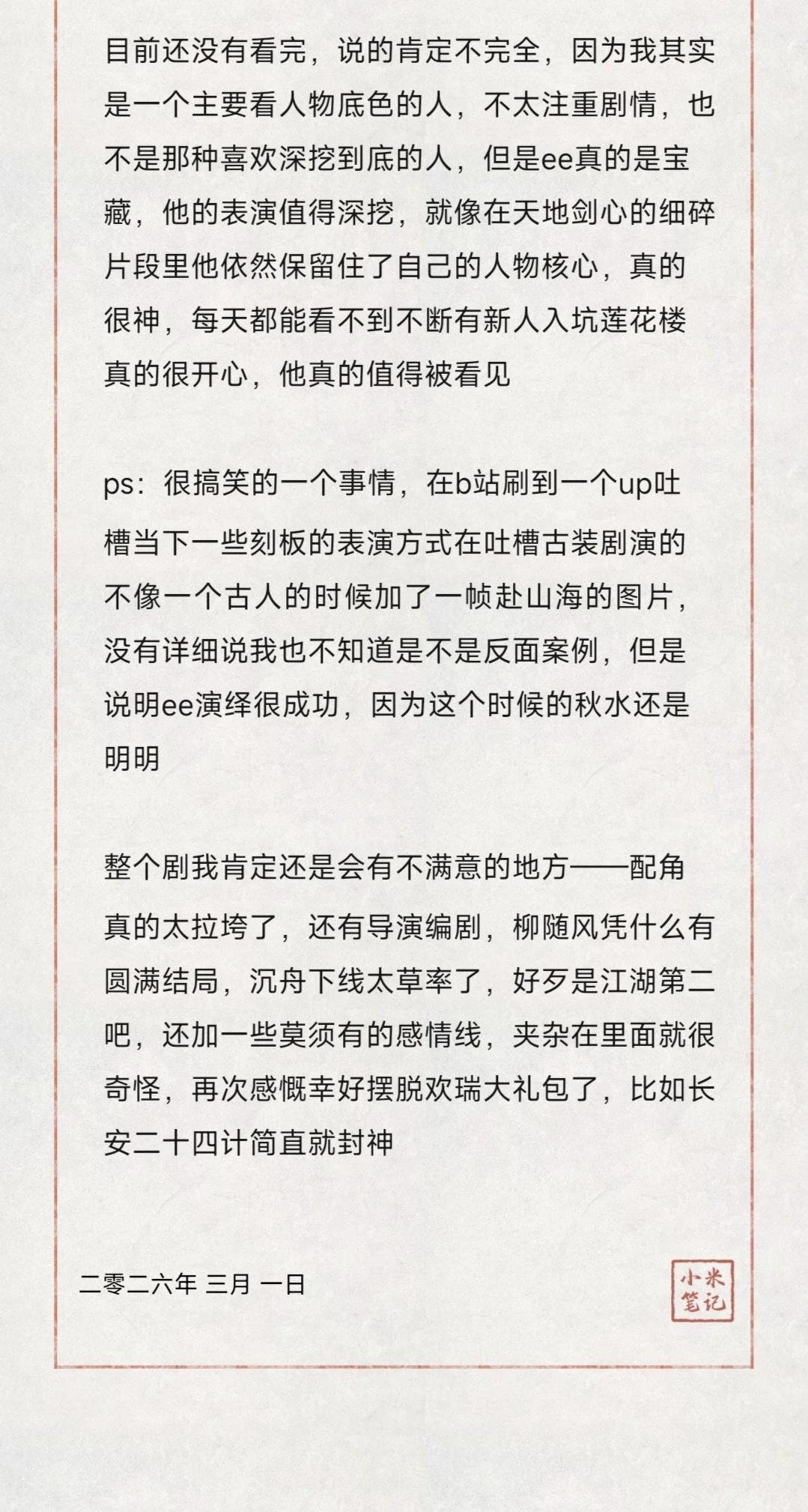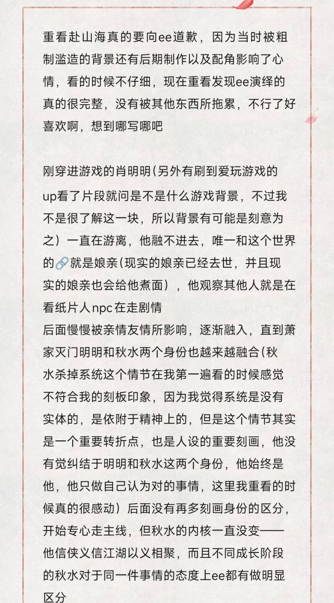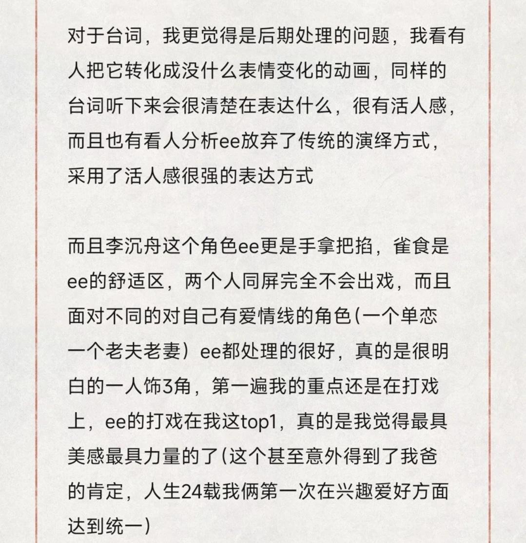 如图,我是第一次为一个剧写这么长篇幅的文字(准确说除了上学写论文没再写过这么长的,看过那么多小说,喜欢过那么多优秀角色,我也没有为他们写过)因为很多时候我的感受都是片段化的,我的逻辑没有那么严谨,但重看赴山海真的很喜欢,要为我当时的心浮气躁道歉,就像ee成毅说的真的需要沉下心去感受(我不是被黑影响的,原因在第一段有写,当时就感觉ee成毅被做局了,很生气) 真的感觉喜欢上ee成毅很幸福,看他的剧很幸福 但其实我的人生角色以及第一个入坑角色是花花来着哈哈哈哈哈哈哈哈但赴山海真的是我觉得愧对ee成毅的,愧对他的用心演绎电视剧 感受一朵花开 幸福感 滑跪道歉 文章 二编:我夸的我道歉的从始至终都只有ee成毅,我作为一个挑剔的观众肯定的只有ee成毅的演绎,他真的棒到可以让我忽略其他,至于后期还有配角并不在我夸奖和维护范围内,关于是否背景声大以及画质如何,首先这与ee成毅无关,其次有很多近几年电视剧的通病,所以近几年的古装剧我看的进去的极少,这个是个人审美问题 三编:真的给我有点整生气了,我的核心只有维护这个用了心的ee大厨,并不是维护这个剧组!!!!!不要再指责我不包容那些拖后腿的了,不回了,我想说的已经表达清楚了