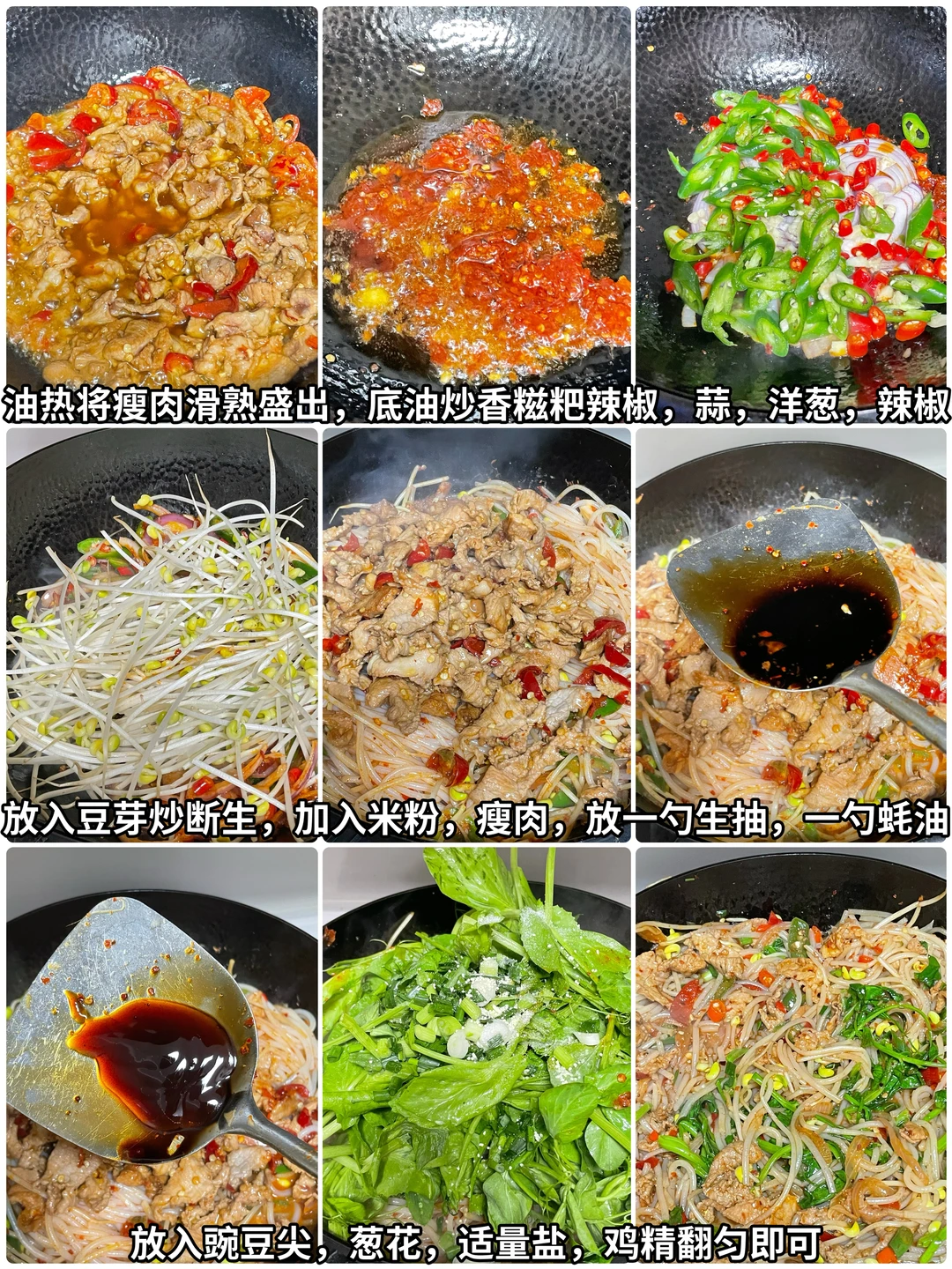 3⃣️起锅烧油,油热再放入一块儿猪油,这样炒出来更香。加入瘦肉和泡椒。快速将瘦肉滑熟,盛出锅里的底油炒香糍粑辣椒和蒜炒出红油,然后放入辣椒和洋葱炒香,加入米粉和辣椒粉翻匀,加入豆芽炒断生,然后加入米粉和辣椒粉翻匀。倒入瘦肉,加入1勺生抽,1勺蚝油,翻匀之后加入豌豆尖,放入适量的盐、鸡精和葱花,翻匀即可出锅。这样做出来的炒粉。真的巨好吃,喜欢的姐妹可以试一下。