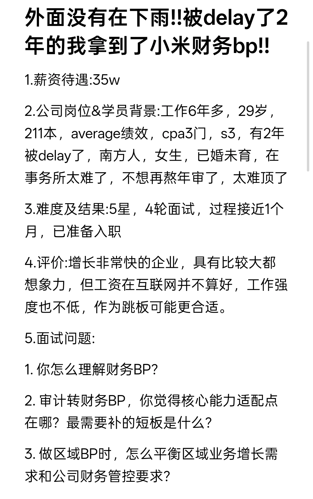 2.公司岗位&学员背景:工作6年多,29岁,211本,average绩效,cpa3门,s3,有2年被delay了,南方人,女生,已婚未育,在事务所太难了,不想再熬年审了,太难顶了