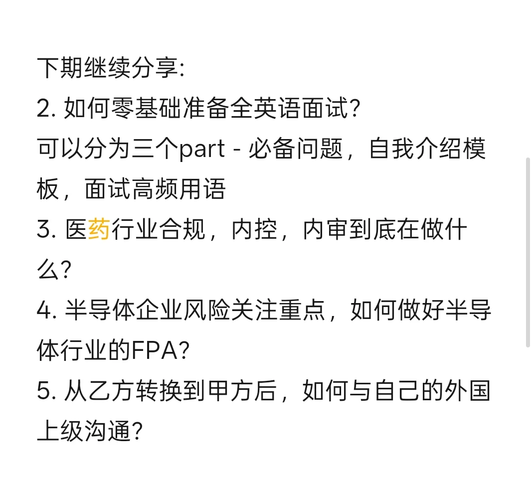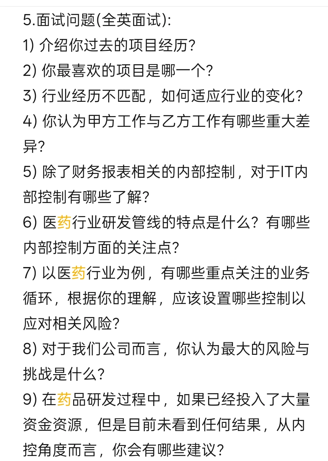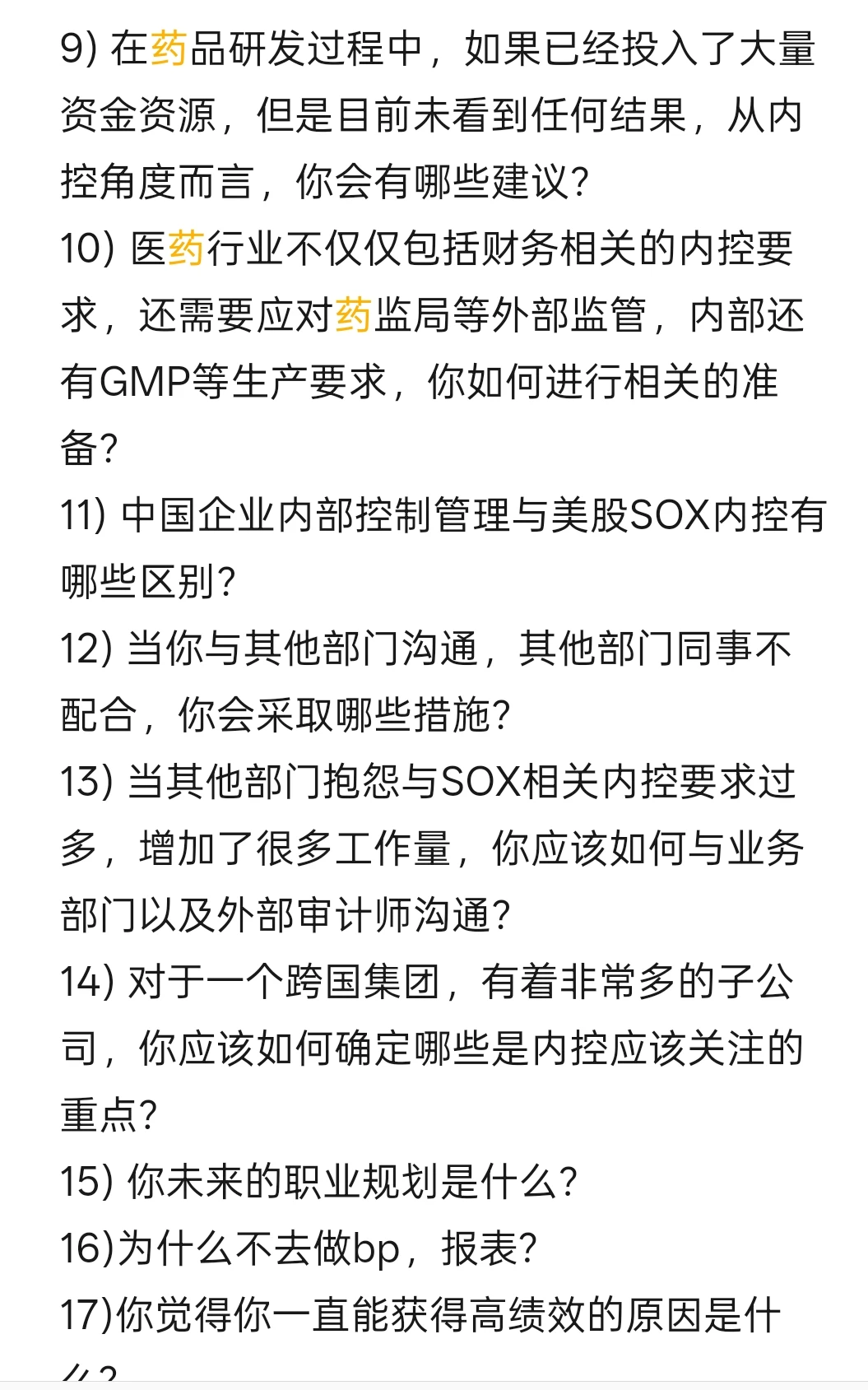 10) 医药行业不仅仅包括财务相关的内控要求,还需要应对药监局等外部监管,内部还有GMP等生产要求,你如何进行相关的准备?