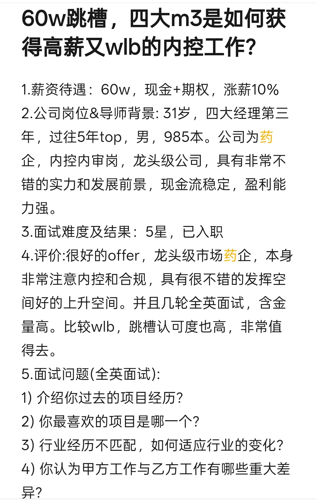 2.公司岗位&导师背景: 31岁,四大经理第三年,过往5年top,男,985本。公司为药企,内控内审岗,龙头级公司,具有非常不错的实力和发展前景,现金流稳定,盈利能力强。