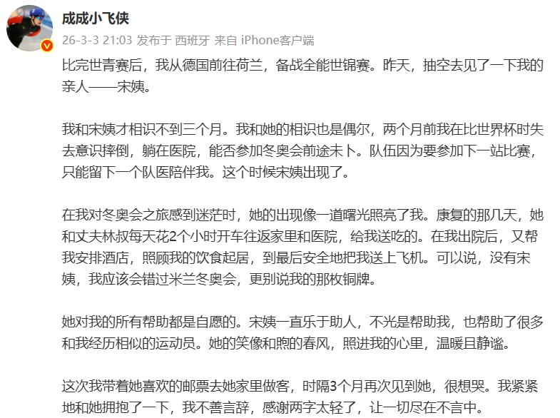 #刘瀚彬发文感谢恩人#不善言辞,唯有感恩。宋姨用日复一日的陪伴与照顾,帮助守住了冬奥梦想,一枚铜牌的背后,是满满的温暖与感动。#看冰雪上咪咕#