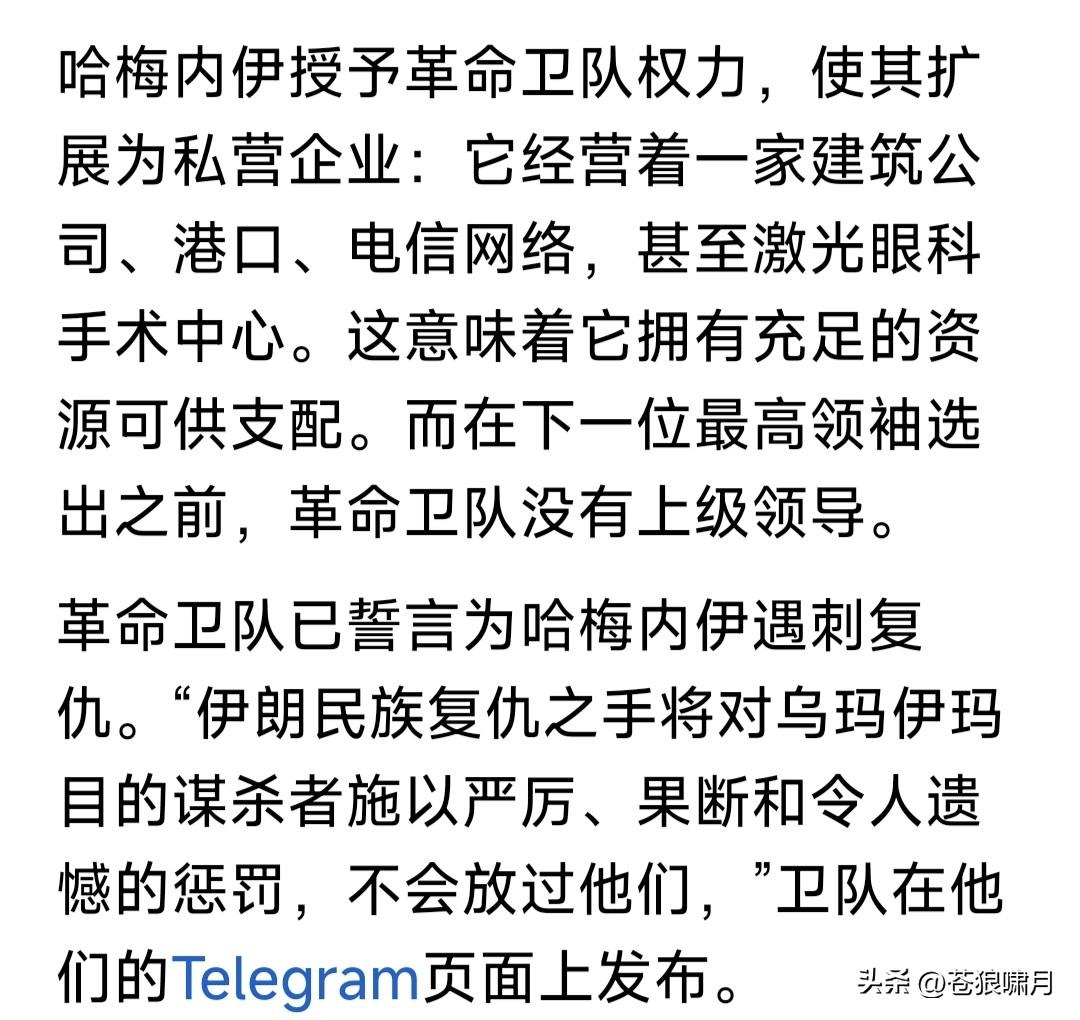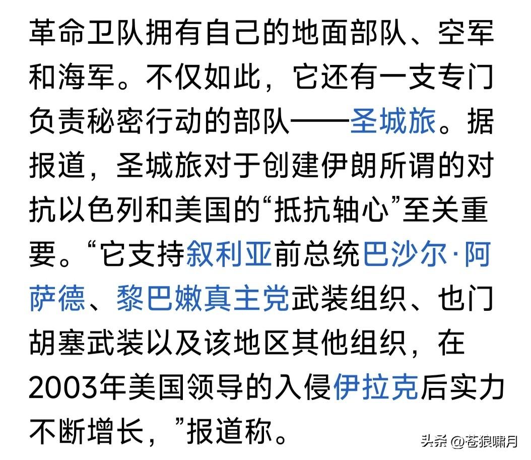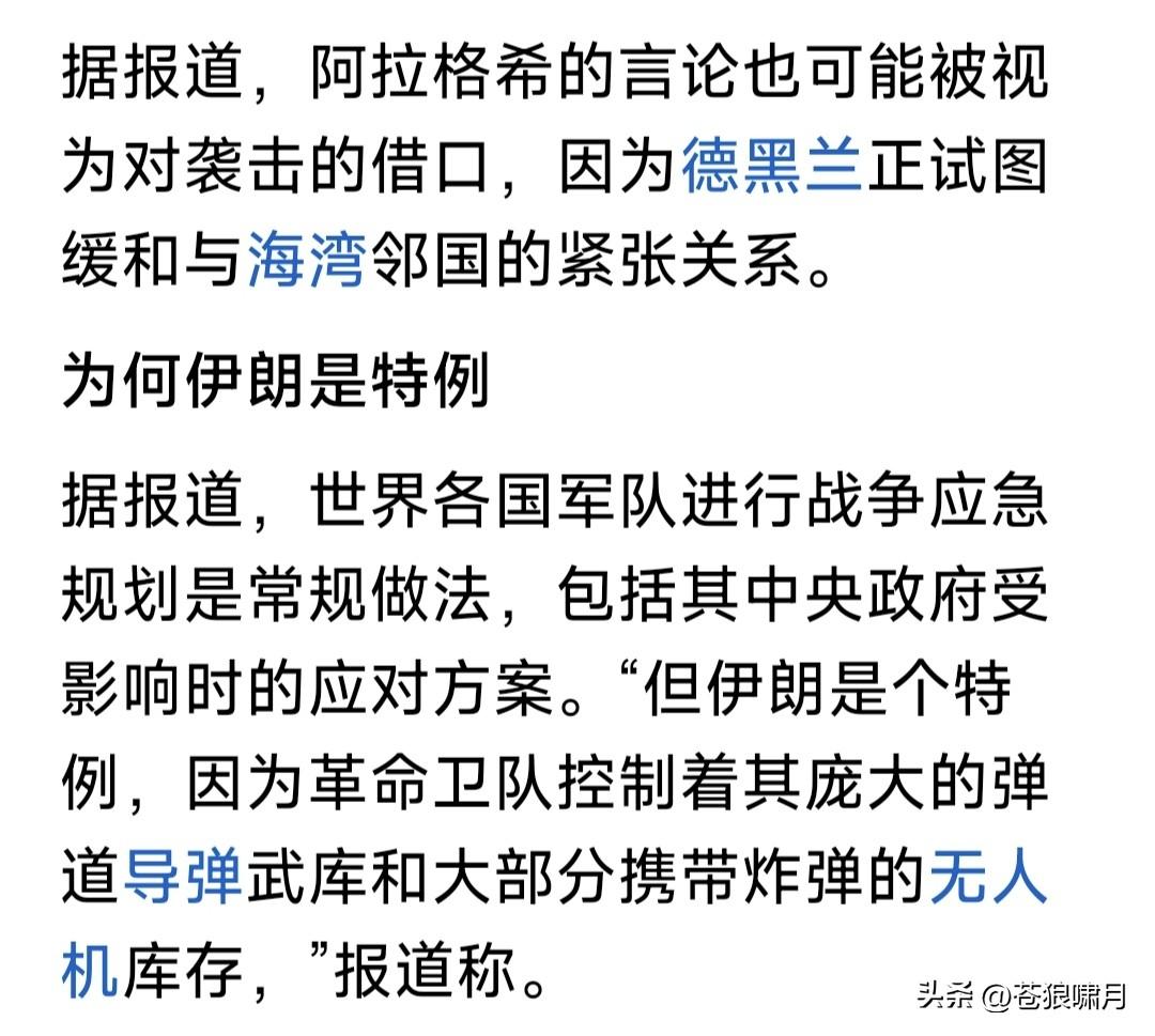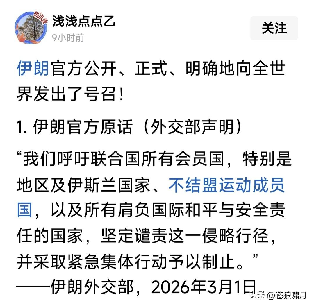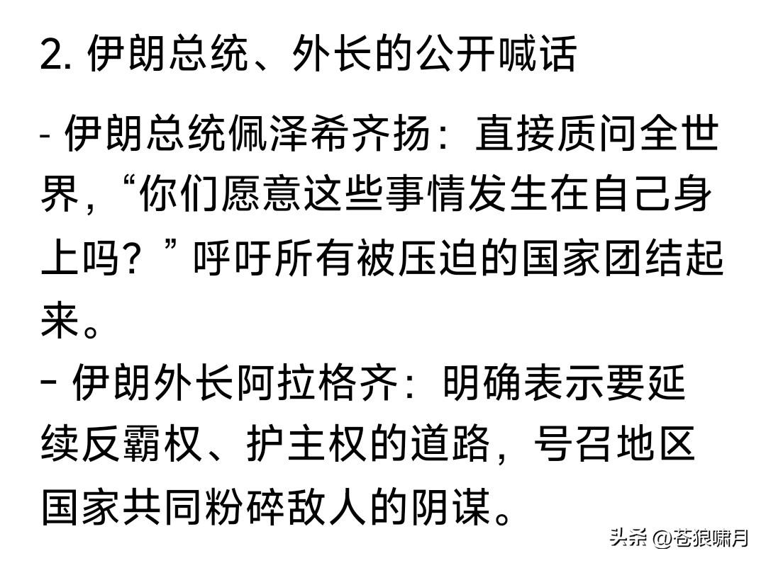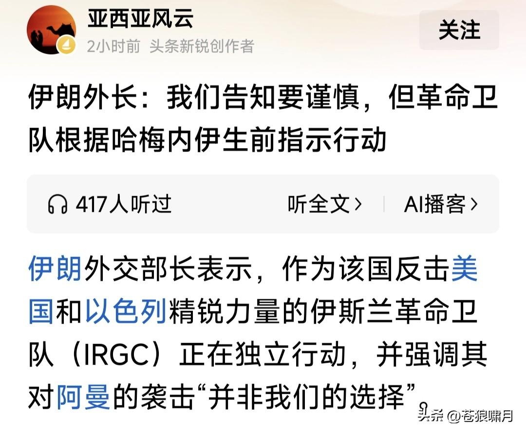 美伊冲突失控,总统外长无奈!美以联手打击,伊朗损失惨重。革命卫队发起反击,袭击以城市与美军驻中东基地,引中东六国与英法德反目成仇。 六国拦截伊朗导弹,还击落伊朗战机。英允美使用其军事基地打击伊朗,宣称将与法德联手,摧毁伊朗导弹!急坏了伊朗总统佩泽与外长阿拉格齐。 他们向联合国喊话,请求支持伊朗,制止美以侵略行为!呼吁伊斯兰国家,不结盟运动国家,世界爱好和平国家,主持公道反对霸权维护世界和平! 阿拉格齐还与中东各国沟通,直接与沙阿约卡巴科等国外长解释,美国驻他们国家大使馆与基地,受到袭击并非他和总统指令,而是革命卫队行为! 看到这些报道,苍狼感到不解: 1.总统佩泽希齐扬,不是哈梅神主殉职后,“专家会”任命的“临时代理三人组”主持人吗?为何掌控不了局势? 2.革命卫队与国防军,都是国家武装。为何前者比后者,待遇高装备好?控制导弹无人机与核研发等国之重器?其高层还控制伊朗石油等重要企业? 3.这次美伊冲突爆发后,佩泽与阿拉格齐就告知军方与革命卫队,除了反击以色列之外,其他谨慎选择目标! 但革命卫队不听劝告,只执行哈神的既定命令,对美国在中东的所有目标,包括大使馆和军事基地全面袭击! 尽这些反击虽然伤害不大,却引发美以加倍报复,惹怒中东六国与英法德三国联手反击,一下子事情闹大了! 看样子冲突不仅停止不了,还有愈演愈烈趋势!佩泽和阿拉格齐无能为力,革命卫队不受控制,各自为政持续反击!势必招致更猛烈打击,怎么办? …………