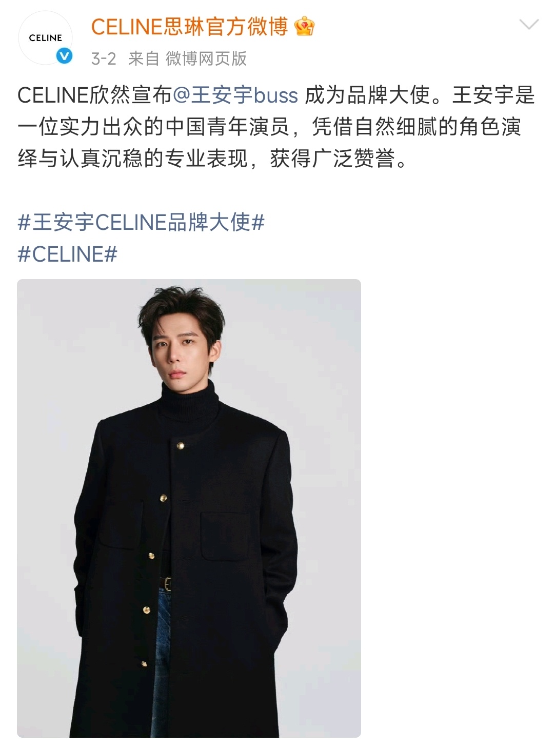 王安宇 王安宇CELINE品牌大使我好像看到了以前最爱节目《挑战不可能》的翻拍!王安宇争气!宇丝女神一样牛逼给力!前有顶奢品牌CELINE唯一且首位中国区男大使的官宣,后有新sw的默默宠爱,还有专门的发布会!做宇丝精彩不断!做宇丝一直爽