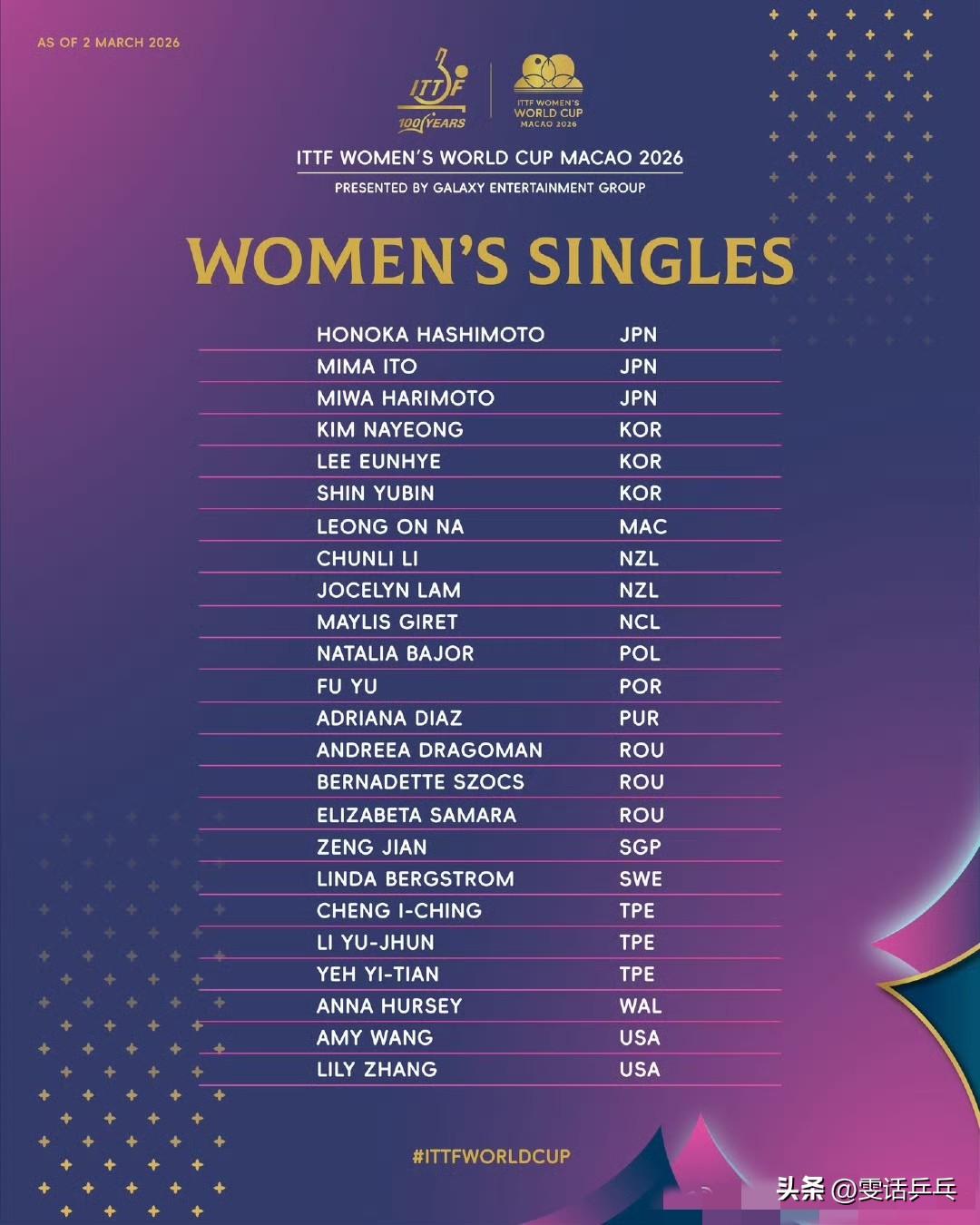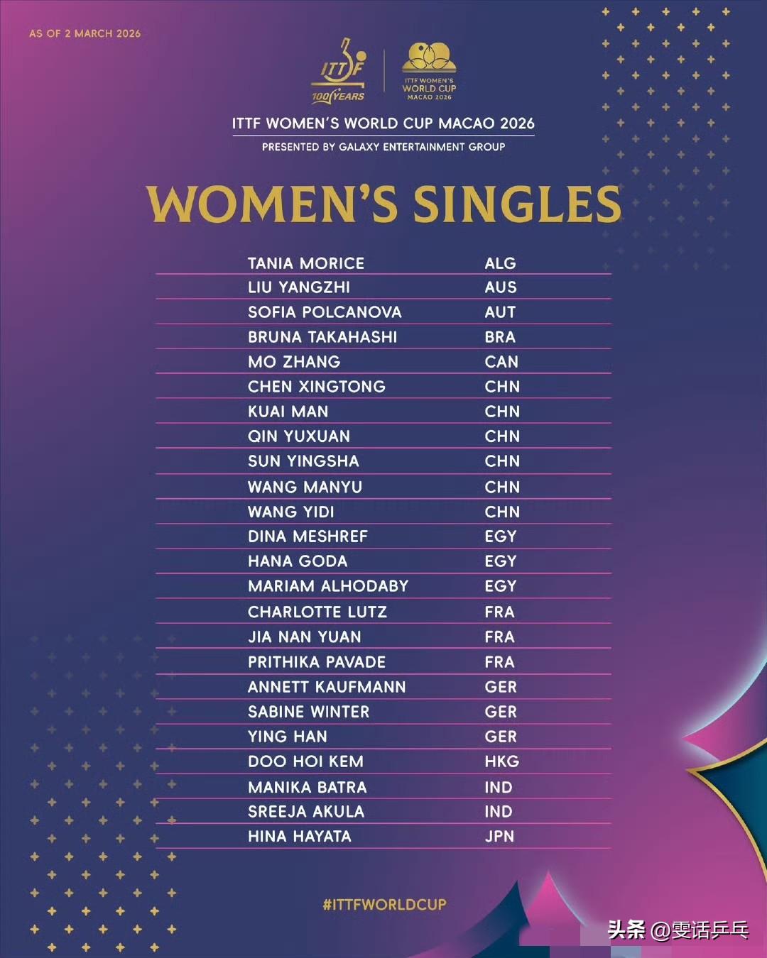 女单外协参赛名单 张本美和🇯🇵、伊藤美诚🇯🇵、早田希娜🇯🇵、桥本帆乃香🇯🇵、申裕斌🇰🇷、莎宾·温特🇩🇪、韩莹🇩🇪、郑怡静(中国台北)、阿德里安娜·迪亚兹🇵🇷、高桥·布鲁娜🇧🇷、袁嘉楠🇫🇷、金娜英🇰🇷、伯纳黛特·斯佐科斯🇷🇴、汉娜·高达🇪🇬、普莉蒂卡·帕瓦德🇫🇷、伊丽莎贝塔·萨马拉🇷🇴、李恩惠🇰🇷、索菲亚·波尔卡诺娃🇦🇹、曾尖🇸🇬、杜凯琹🇭🇰、刘杨子🇦🇺、王艾米🇺🇸、安娜·赫西🏴、斯莉嘉·阿库拉🇮🇳、张安🇺🇸、蒂娜·梅谢芙🇪🇬、玛尼卡·巴特拉🇮🇳、安妮特·考夫蔓🇩🇪、安德烈娅·德拉戈曼🇷🇴、夏洛特·卢茨🇫🇷、琳达·伯格斯特隆🇸🇪、李昱谆(中国台北)、叶伊恬(中国台北)、张墨🇨🇦、付玉🇵🇹、娜塔莉娅·巴约🇵🇱、玛利亚姆·阿尔霍达比🇪🇬、乔斯林·林🇳🇿、李春丽🇳🇿、塔妮亚·莫里茨🇩🇿、吉雷特·梅利斯🇫🇷、梁安娜🇲🇴 【新增:娜塔莉娅·巴约🇵🇱;已满额】 2026.3.3