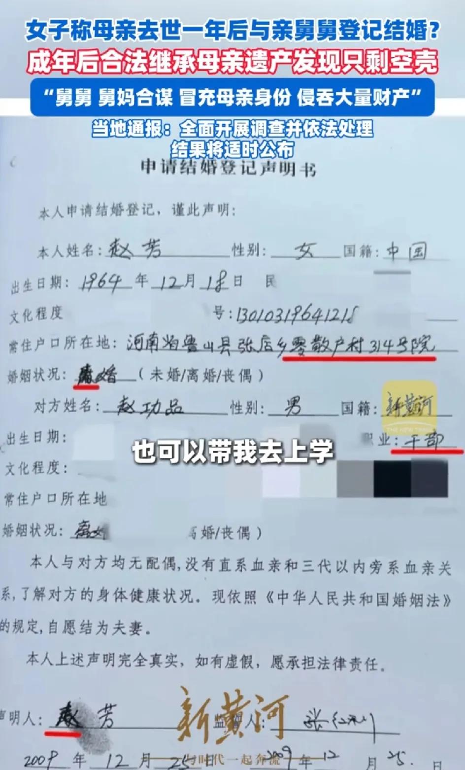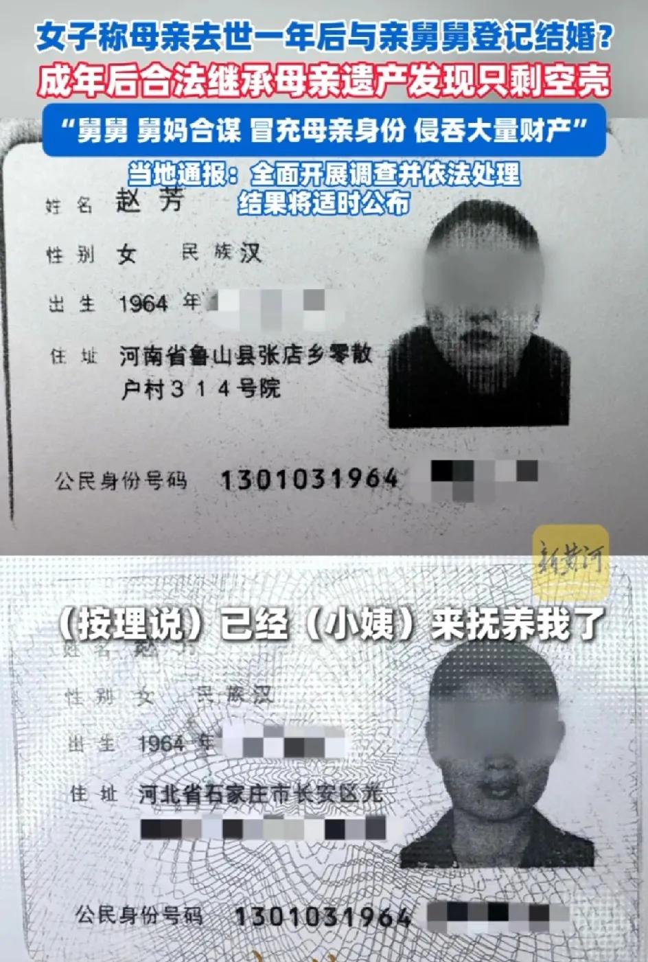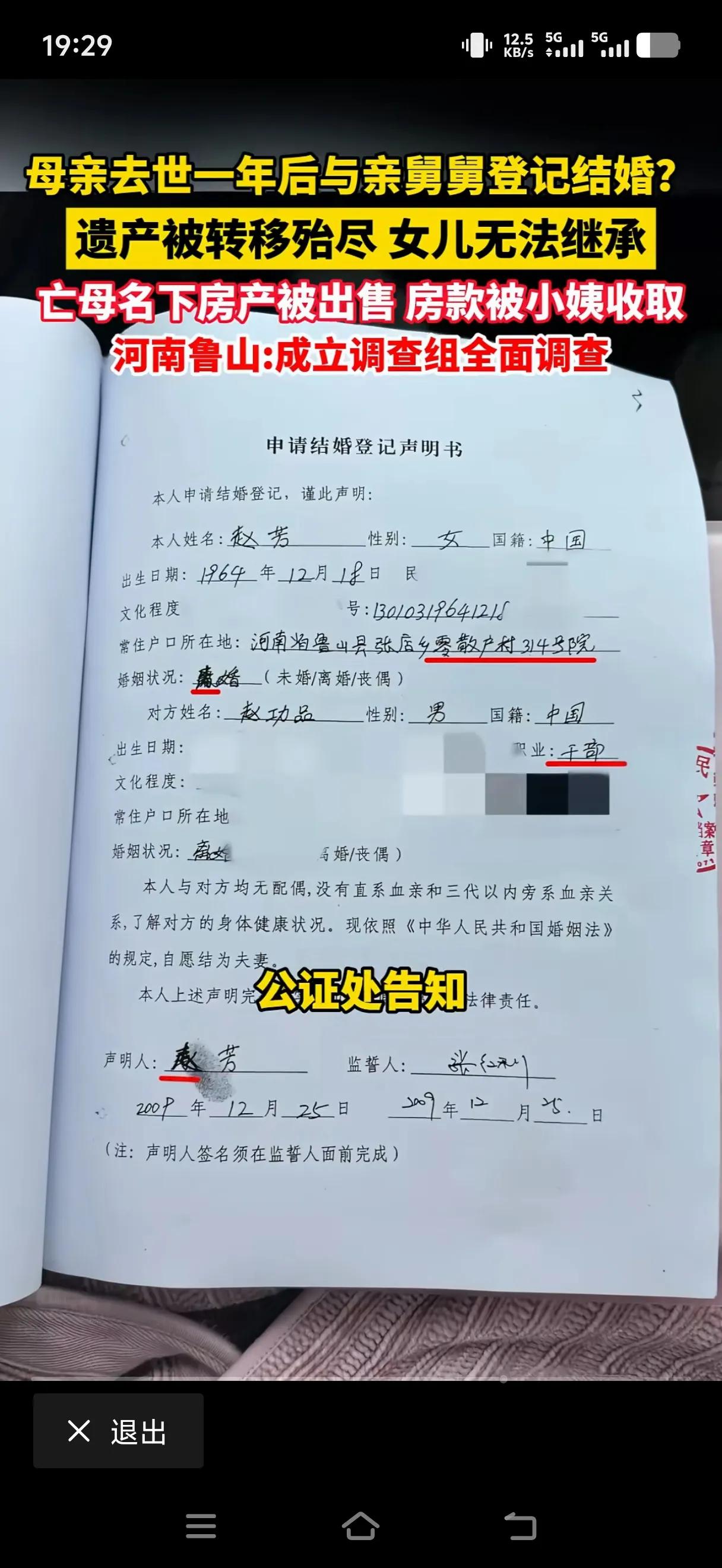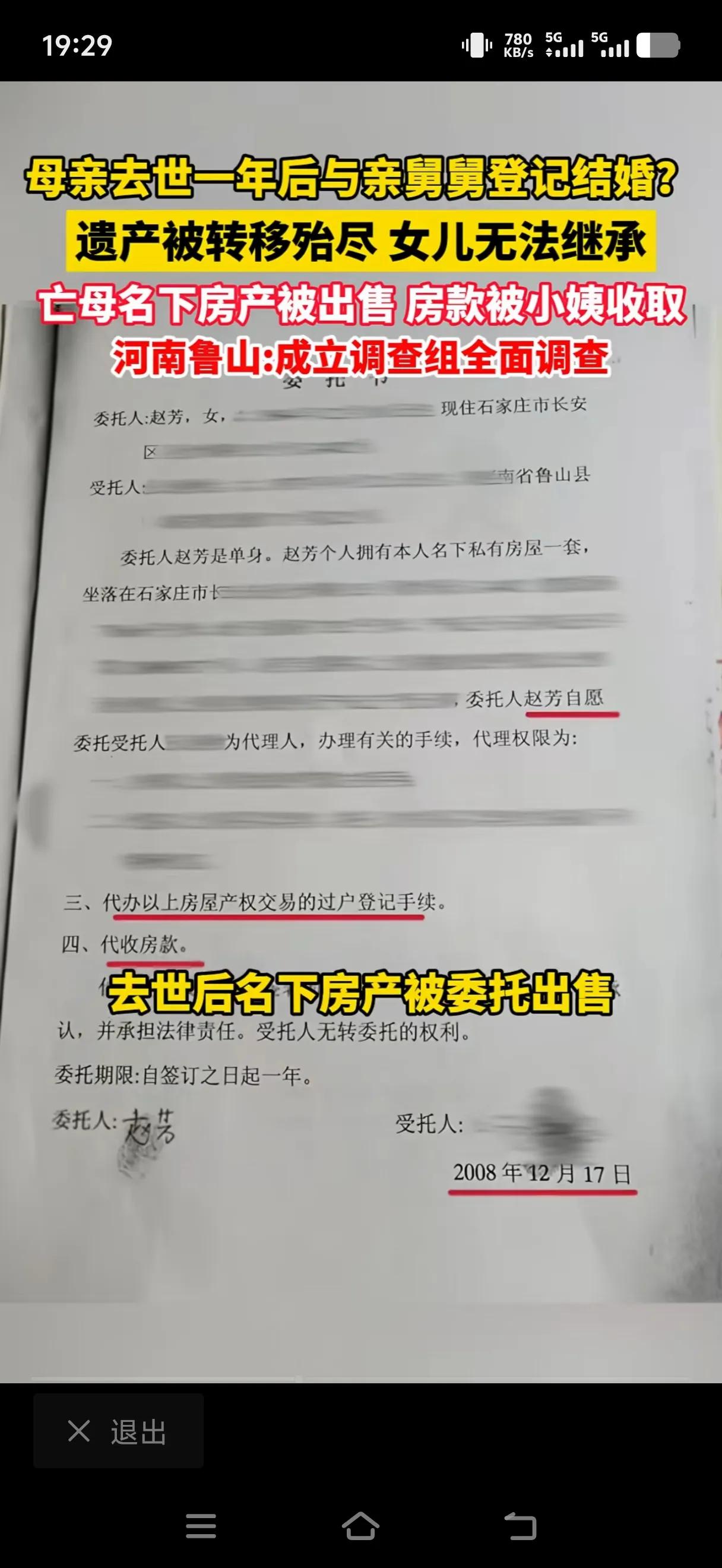 母亲去世一年后与亲舅舅登记结婚?当地通报网友母亲去世后被结婚,当事人 舅舅舅妈小姨一顿操作猛如虎,吃绝户。 她的妈妈赵芳在2008年11月29日生病 ,在河北第三医院住院。12月1日,她的舅舅和小姨强行把她妈妈从医院拉回老家河南平顶山医院。12月3日又强行从医院带回家,当日死亡,当日埋葬。 10年之后,她想继承妈妈的财产,发现妈妈的财产全都不翼而飞,包括股票,珠宝,商铺,房产。更为惊奇的是,他妈妈在离世一年后的2009年,居然和他的舅舅办了结婚证。 后来得知在她妈妈离世的当天,小姨就拿到一份委托书,售卖了她妈妈的房产。 她妈妈没有留下一份遗嘱。所有的财产都被舅舅,舅妈,小姨吃了。