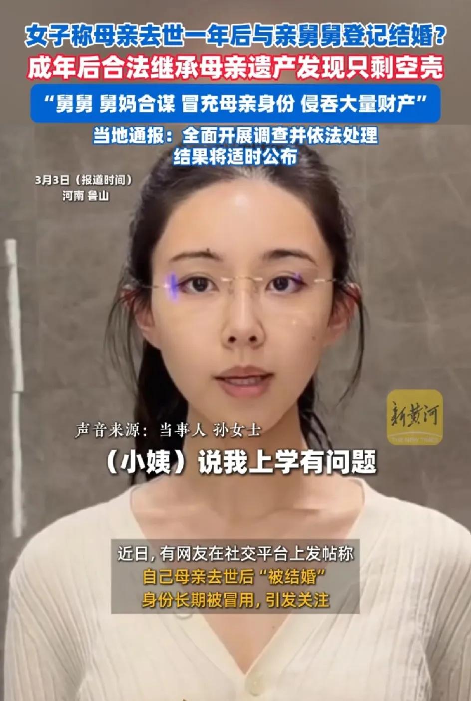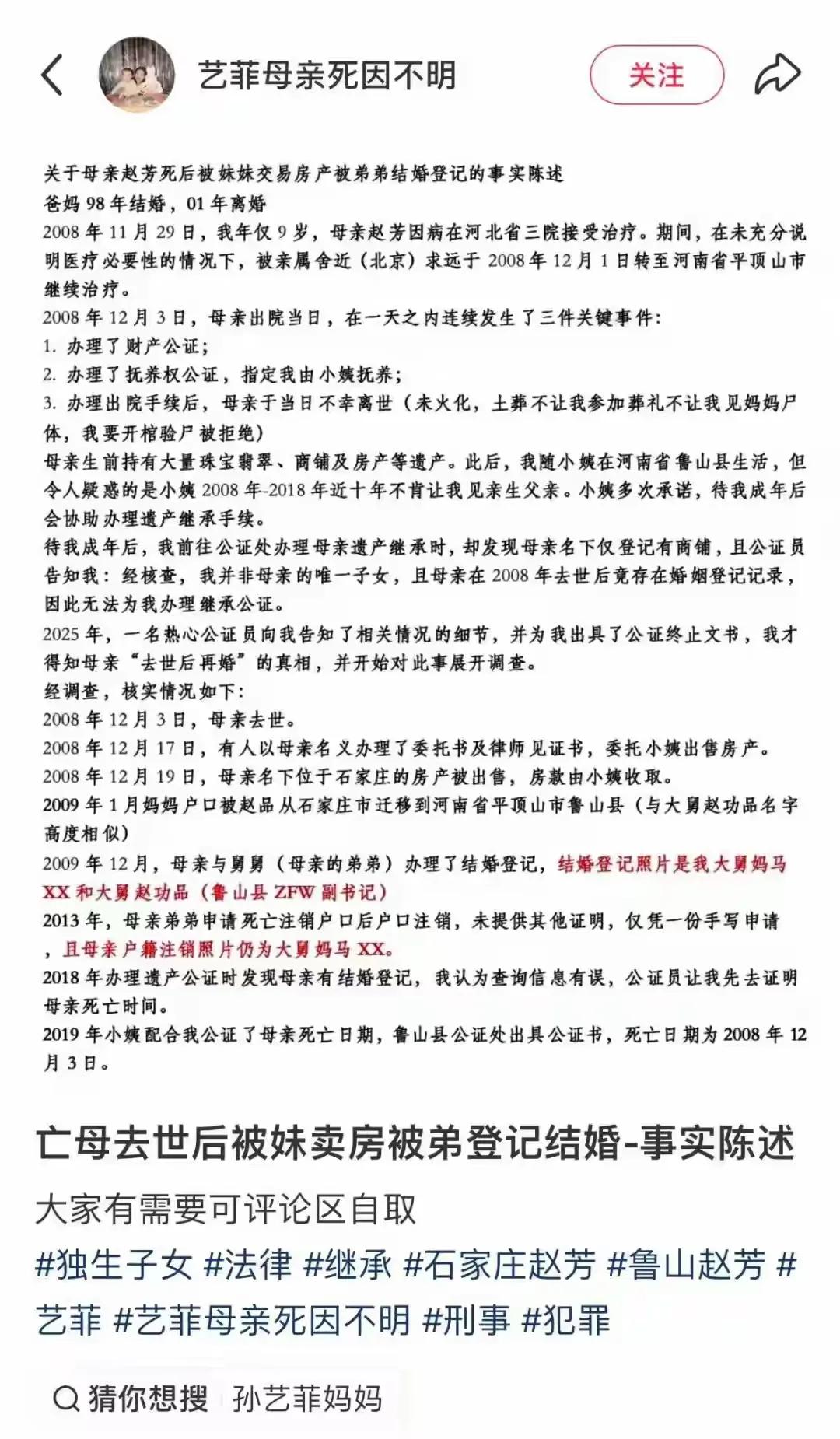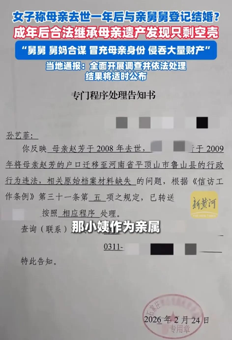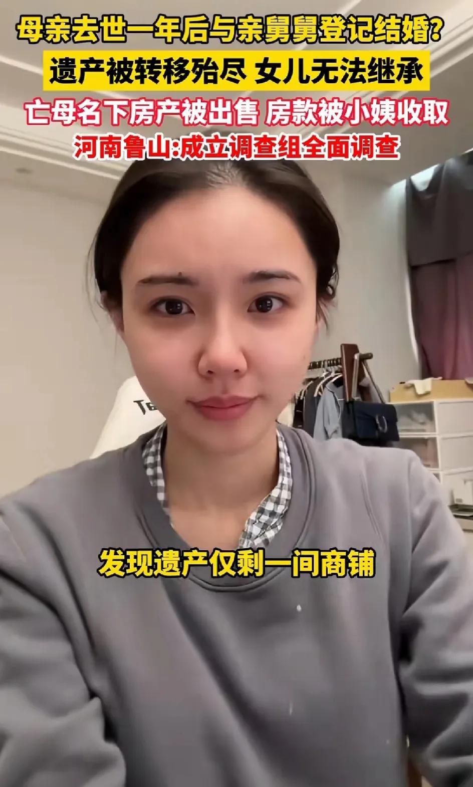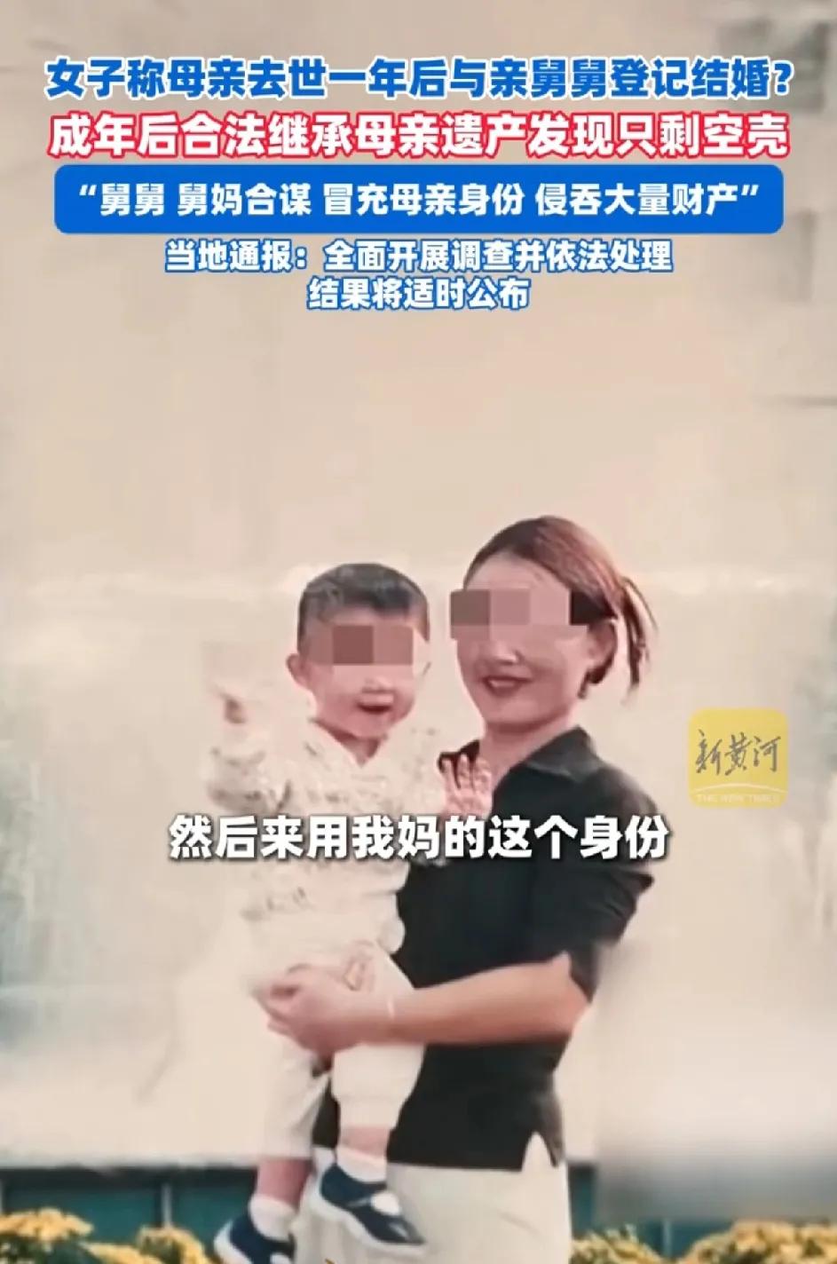 母亲去世一年后与亲舅舅登记结婚?当地通报网友母亲去世后被结婚,当事人 舅舅舅妈小姨一顿操作猛如虎,吃绝户。 她的妈妈赵芳在2008年11月29日生病 ,在河北第三医院住院。12月1日,她的舅舅和小姨强行把她妈妈从医院拉回老家河南平顶山医院。12月3日又强行从医院带回家,当日死亡,当日埋葬。 10年之后,她想继承妈妈的财产,发现妈妈的财产全都不翼而飞,包括股票,珠宝,商铺,房产。更为惊奇的是,他妈妈在离世一年后的2009年,居然和他的舅舅办了结婚证。 后来得知在她妈妈离世的当天,小姨就拿到一份委托书,售卖了她妈妈的房产。 她妈妈没有留下一份遗嘱。所有的财产都被舅舅,舅妈,小姨吃了。