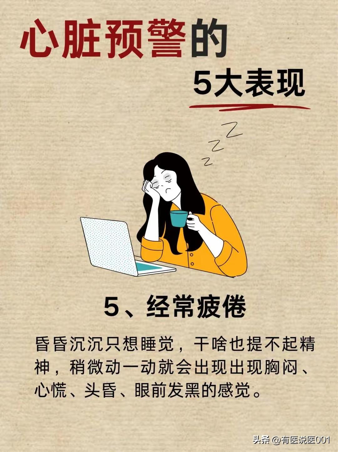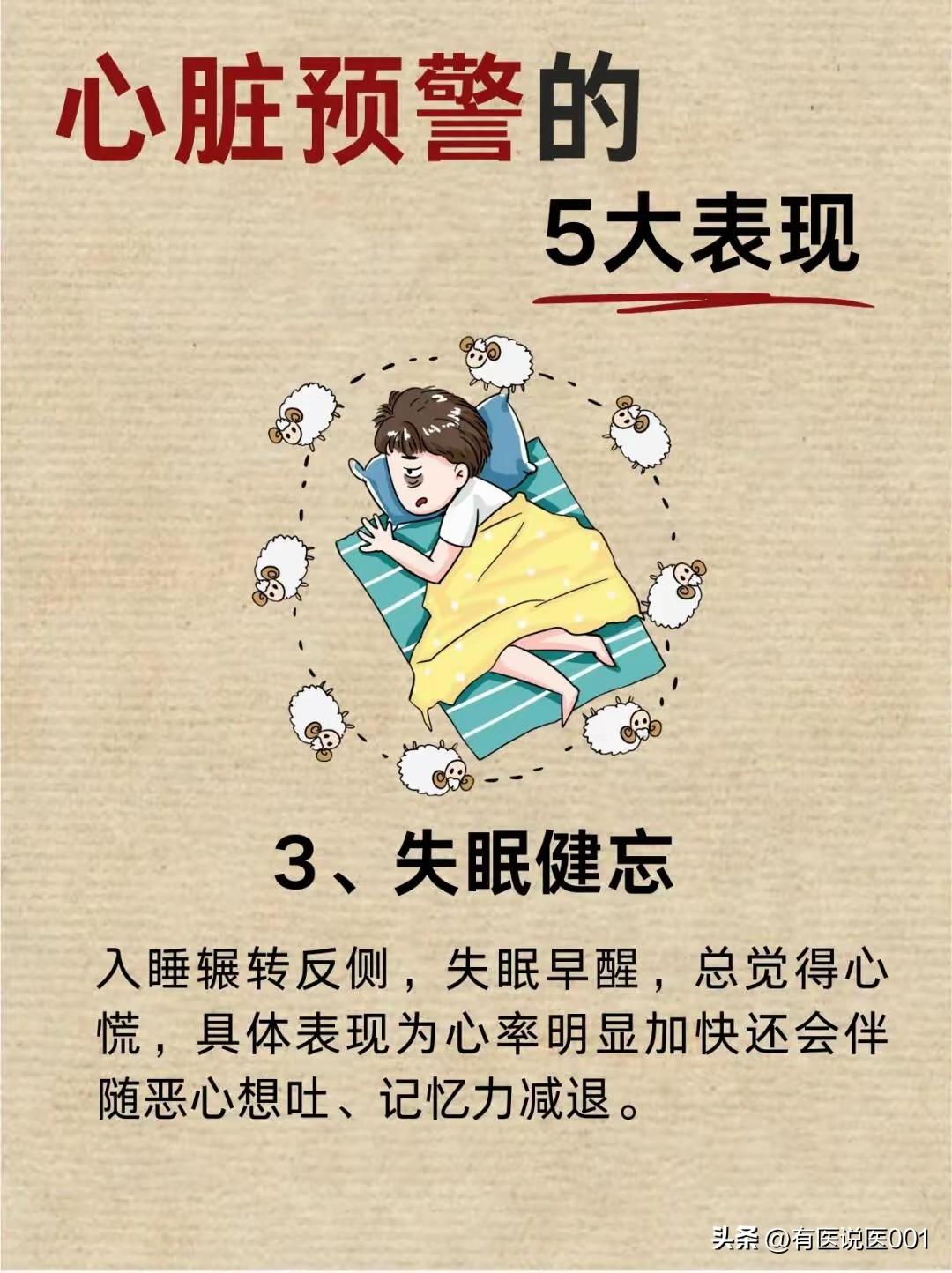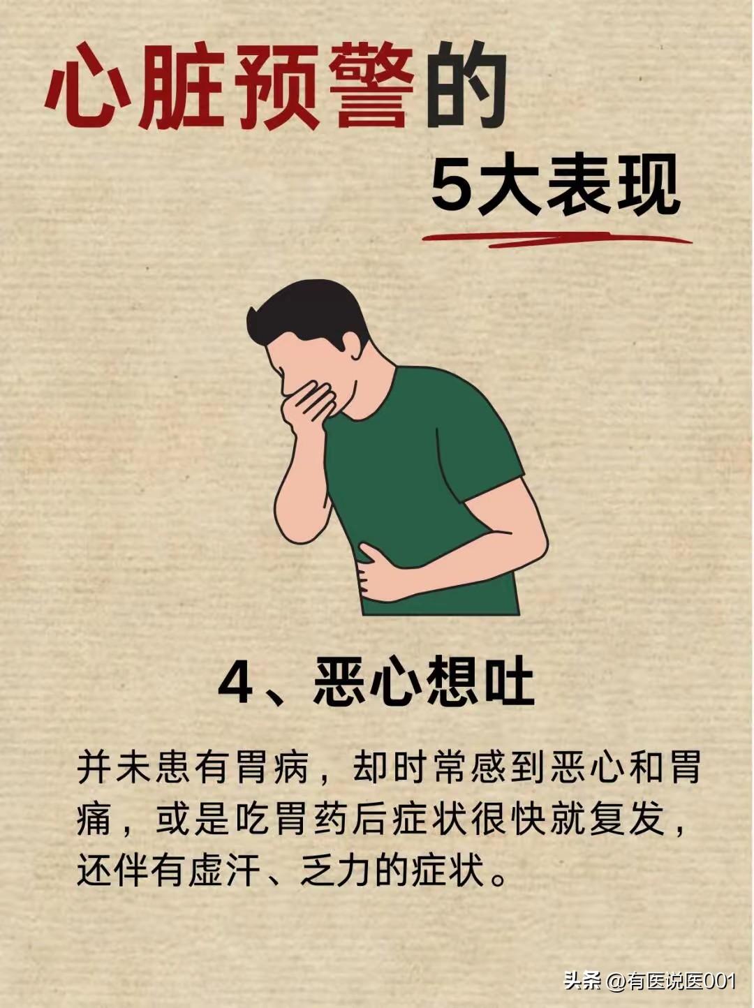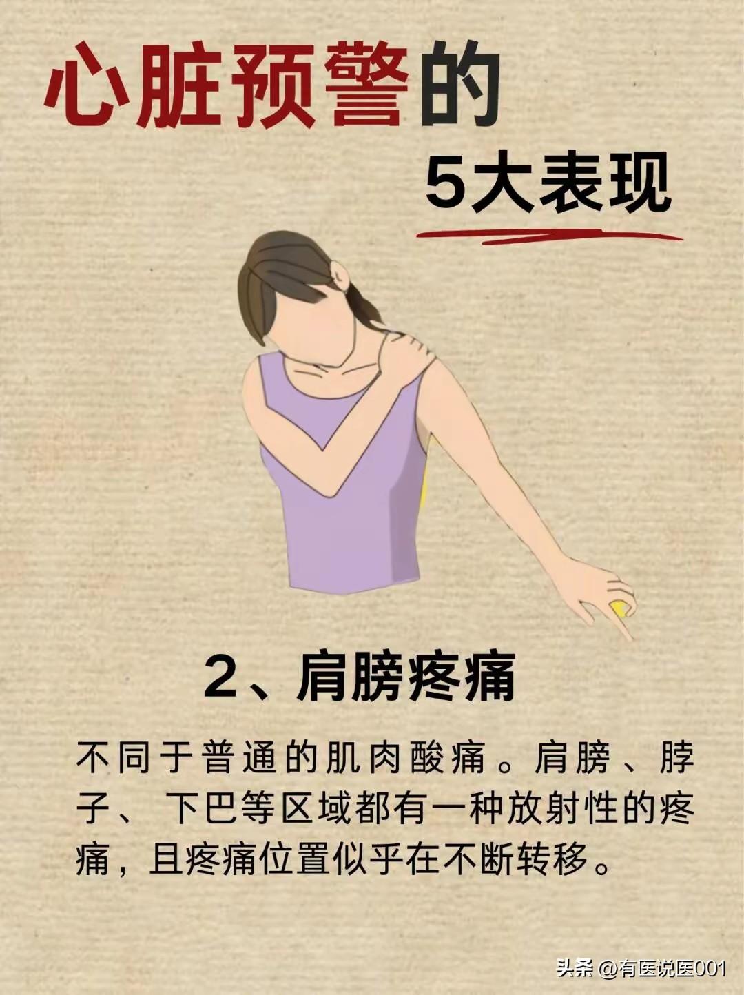 心脏发出的5个“求救信号”,别当成小毛病扛着! 很多人以为心梗、心绞痛都是“突然来袭”,其实心脏在“求救”前,早就给过我们不少信号,只是被当成了“小毛病”扛过去了。今天就说说心脏预警的5个常见表现,别再忽视了! 1. 频繁出汗 没运动、没发烧,却反复出冷汗,尤其是颈部、后背、头皮和手脚心,这可不是“体虚”。当心脏供血不足时,身体会通过出汗调节状态,别只想着喝补汤“补虚”,先去查查心脏更稳妥。 2. 肩膀疼痛 肩膀、脖子、下巴出现放射性疼痛,位置还会转移,贴膏药、按摩都没用,这和普通肌肉酸痛不一样。这种疼痛可能是心脏问题放射到这些部位,尤其是左肩痛,别当成肩周炎硬扛。 3. 失眠健忘 入睡难、早醒,总觉得心慌,心率明显加快,还伴随恶心想吐、记忆力减退,这不是单纯的“失眠症”。心脏供血不足会影响神经和脑部供氧,长期这样要警惕心脏问题。 4. 恶心想吐 没胃病,却总感到恶心胃痛,吃胃药后症状很快复发,还伴有虚汗、乏力,这是心脏问题影响了胃肠道供血。别当成胃病拖,尤其是中老年人,出现这种情况要及时查心电图。 5. 经常疲倦 昏昏沉沉只想睡觉,干啥都提不起精神,稍微动一动就胸闷、心慌、头昏,甚至眼前发黑,这不是“没休息好”。心脏泵血能力下降,身体供氧不足,就会出现这种持续的疲惫感。 ⚠️ 温馨提示:这些表现不是绝对指向心脏病,但如果出现多个,或者持续不缓解,一定要及时去医院检查,尤其是有高血压、高血脂、糖尿病的高危人群,更要把心脏健康放在心上。别等问题严重了才后悔,早发现早干预才是最稳妥的。