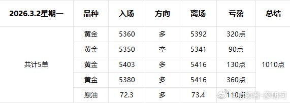2026.3.2星期一;回顾昨日我们共计操作5单其中4单黄金一单原油,5次出手5次全胜合计拿下1010点!受到周末消息面的关系周一跳高大涨,我们多次去看多都收获颇丰!