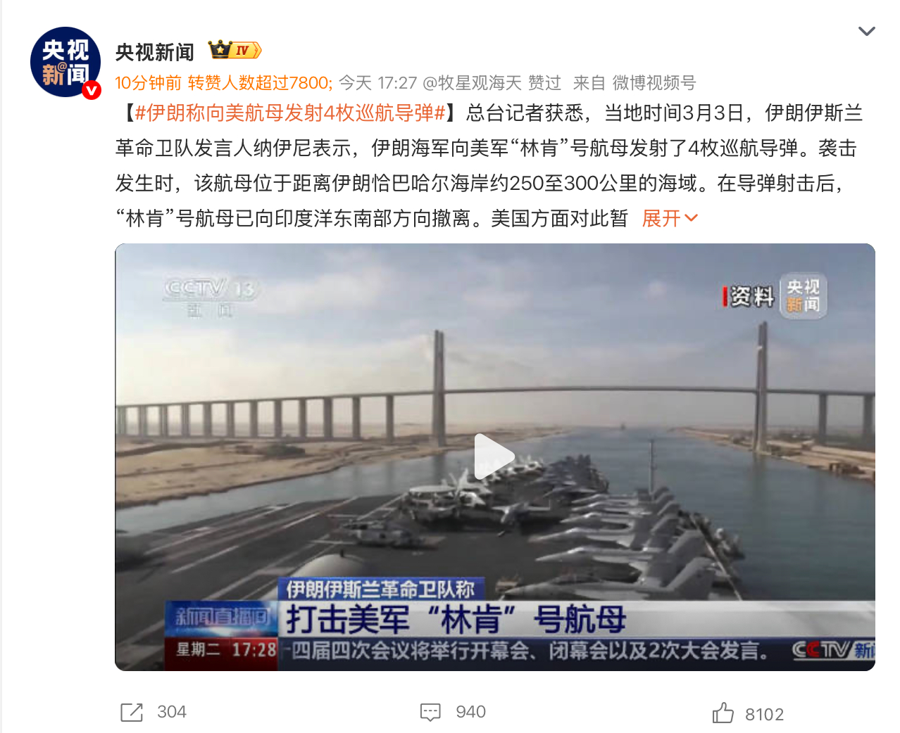美伊以冲突伊朗称向美航母发射4枚巡航导弹热点现场