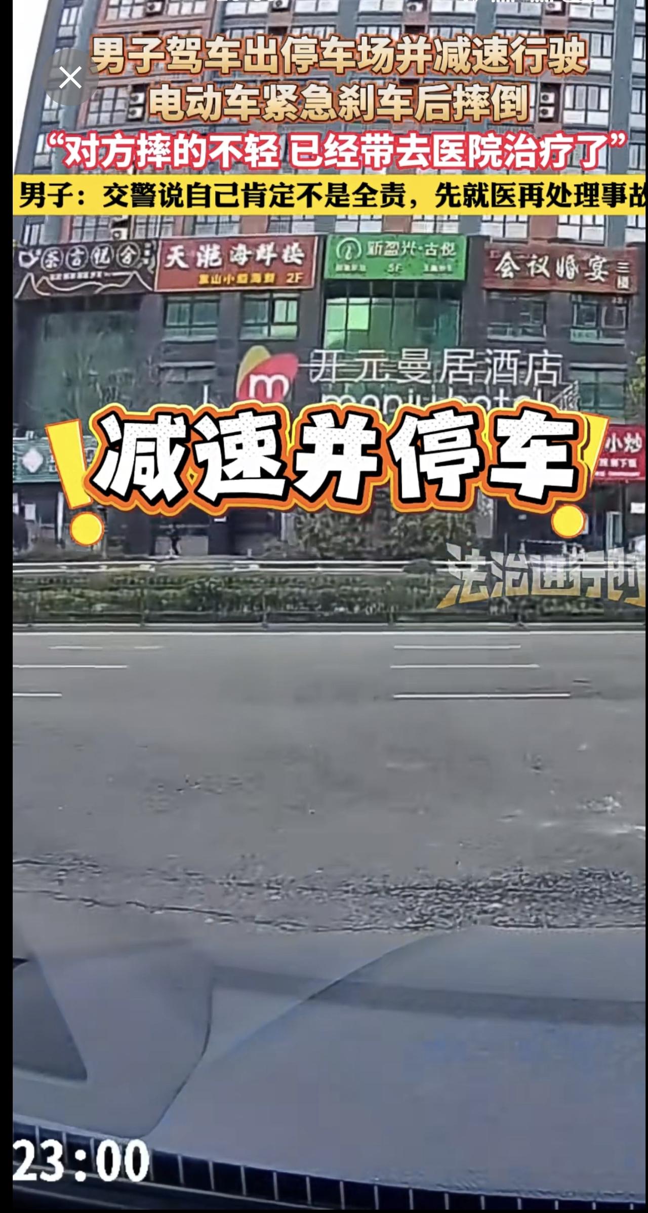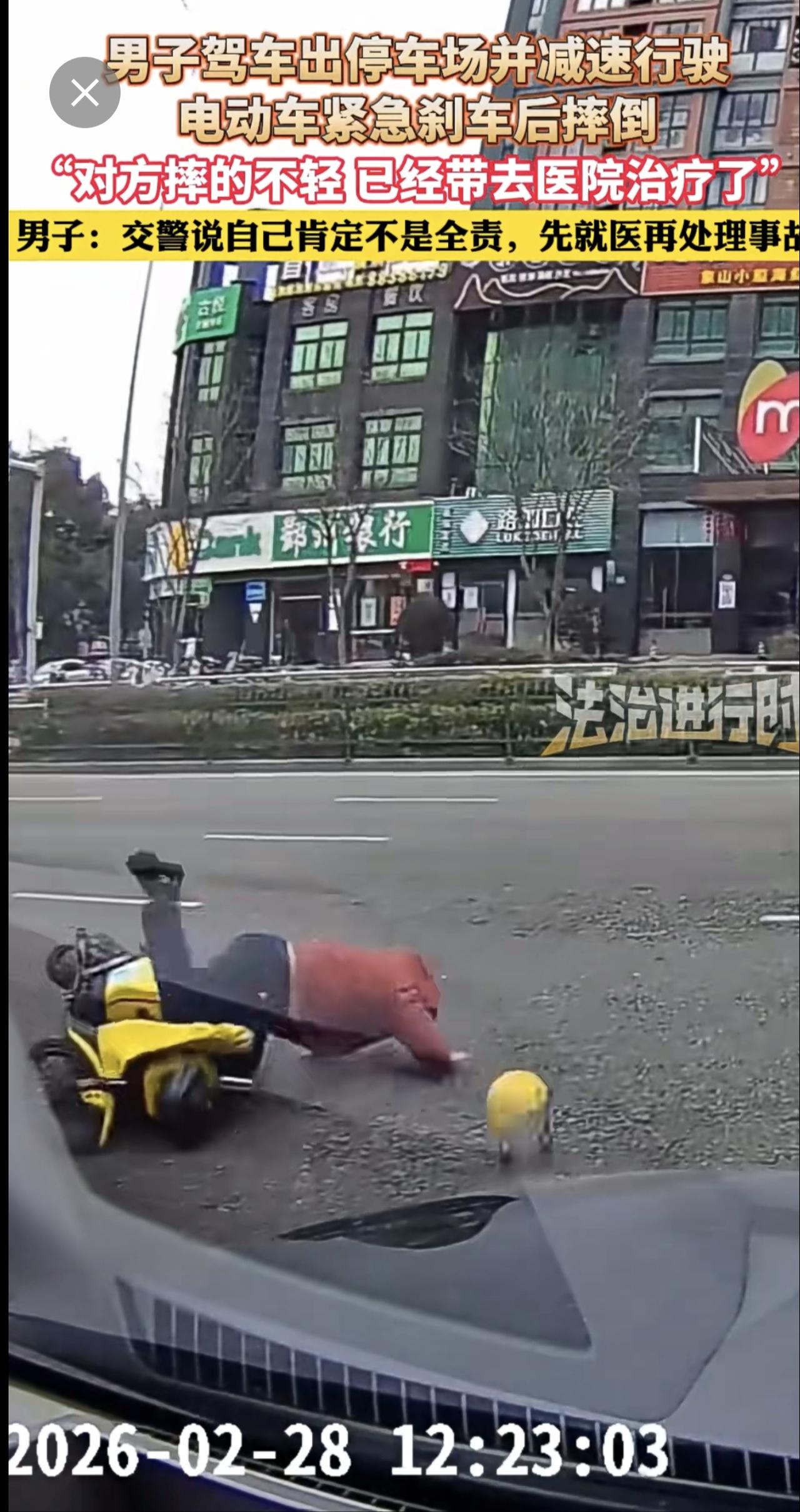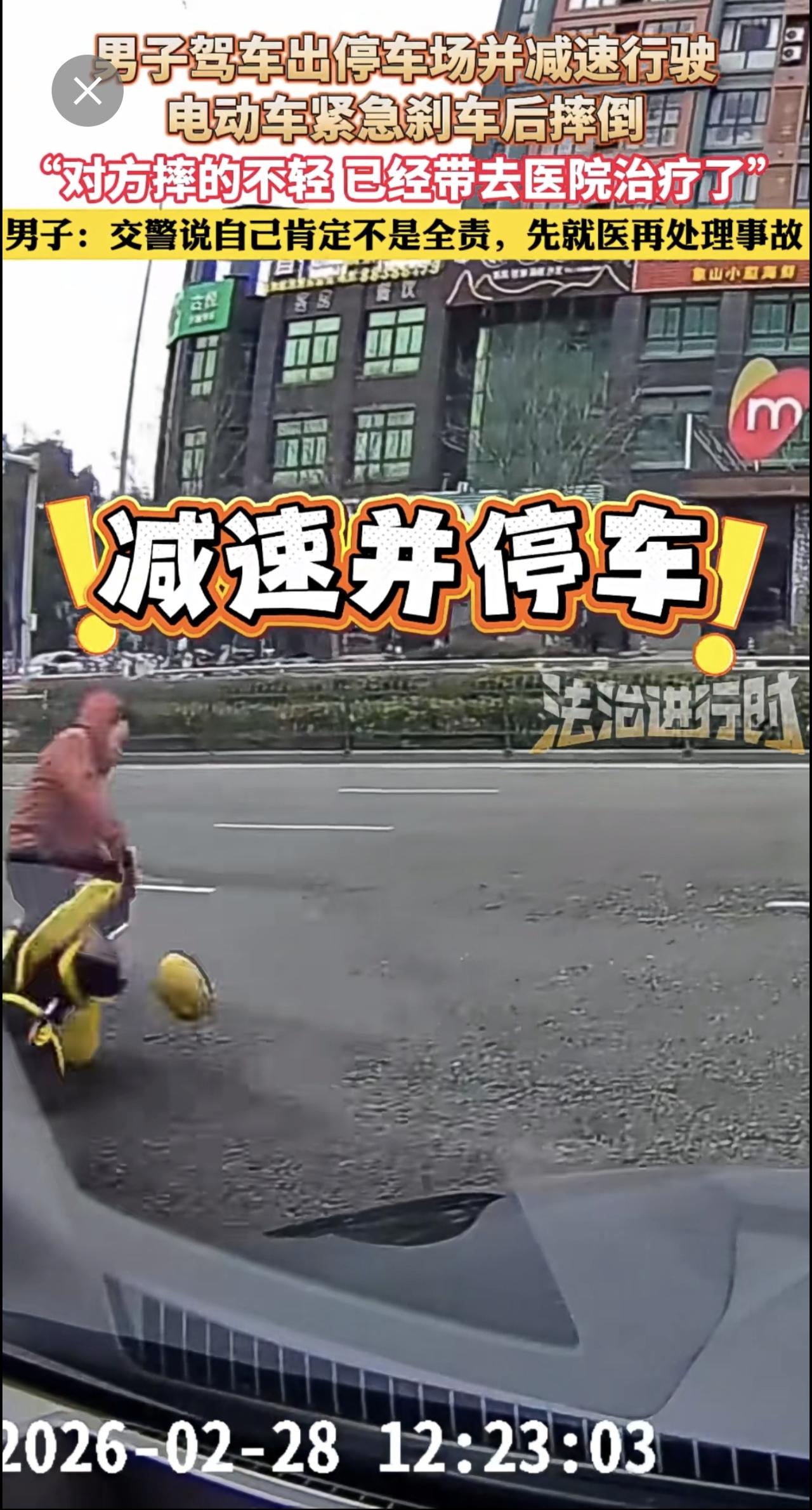 男子驾车出停车场并减速行驶,电动车紧急刹车后摔倒。