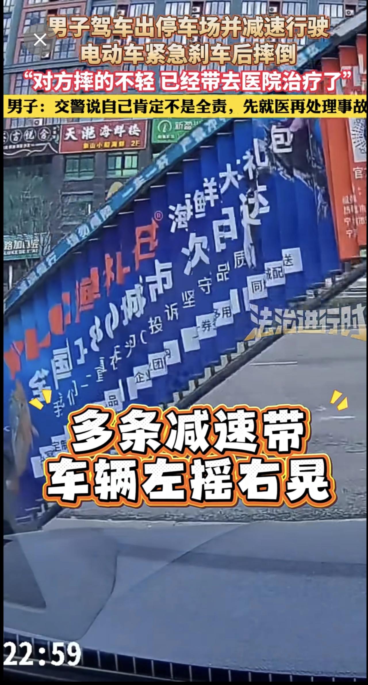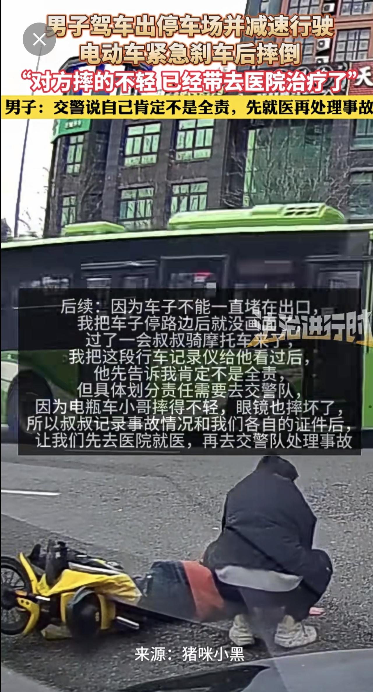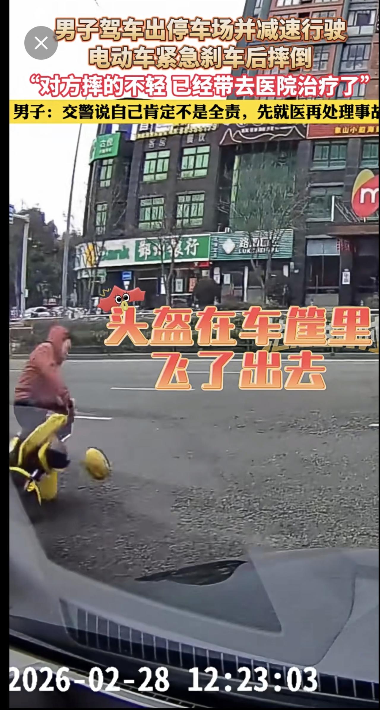 男子驾车出停车场并减速行驶,电动车紧急刹车后摔倒。