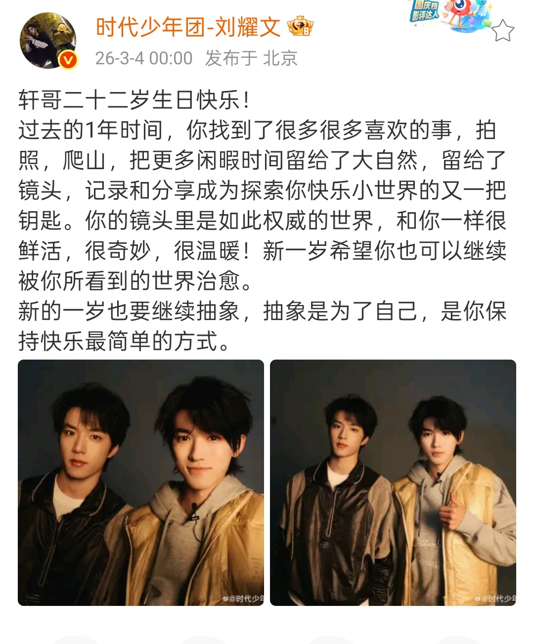 刘耀文祝宋亚轩继续抽象 刘耀文卡点为宋亚轩庆生,说哥哥“很鲜活,很奇妙,很温暖!新一岁希望你也可以继续被你所看到的世界治愈。新的一岁也要继续抽象,抽象是为了自己,是你保持快乐最简单的方式。”刘耀文说宋亚轩鲜活奇妙温暖