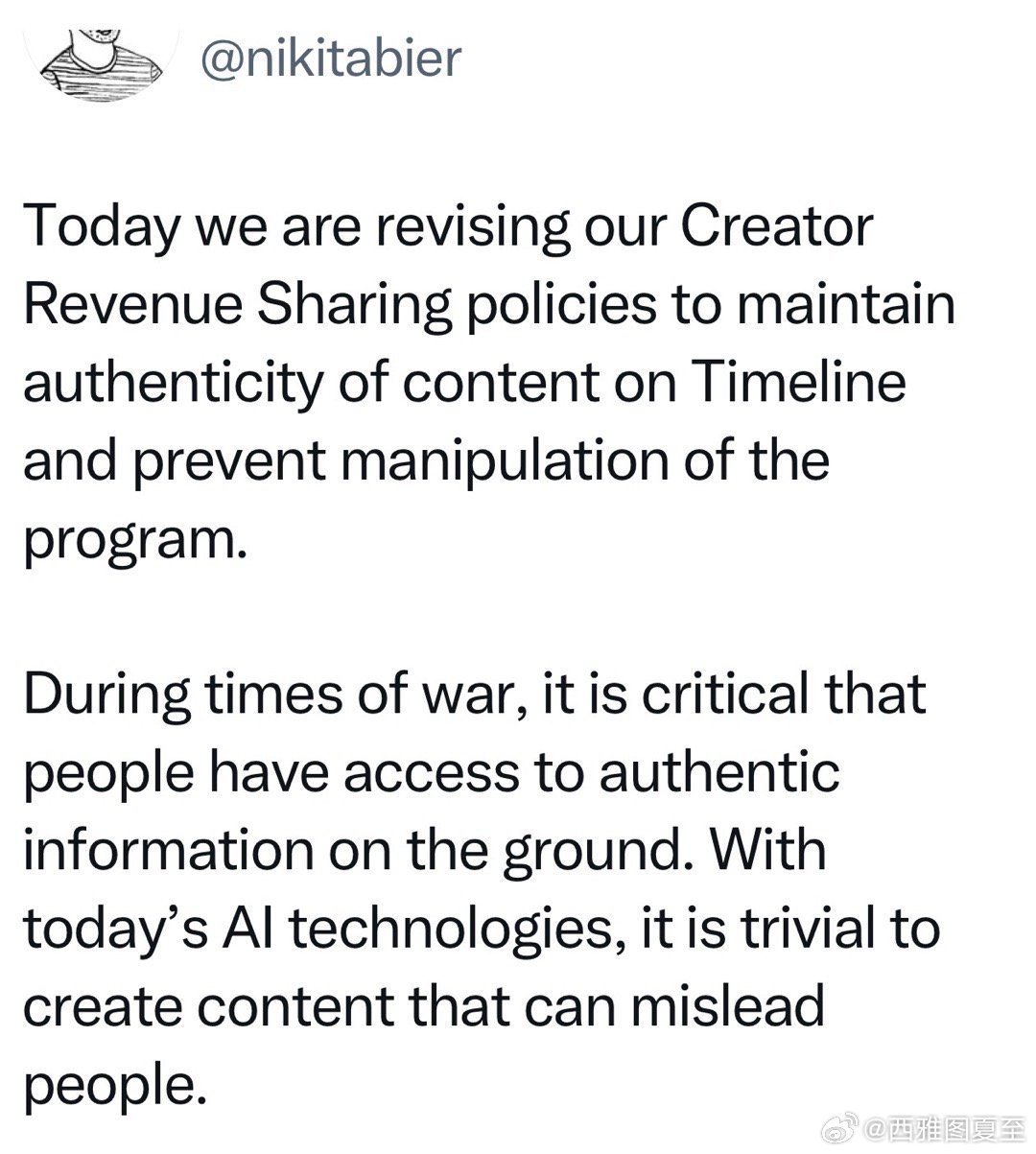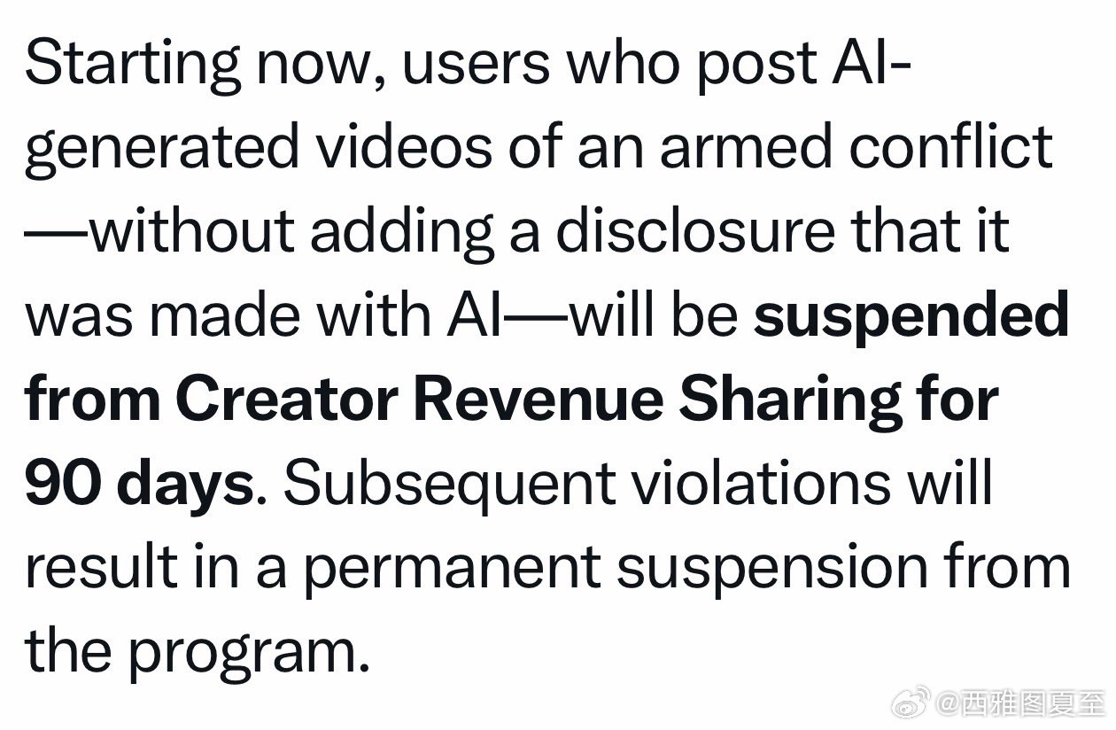 推特(X)宣布:用AI做战争视频、传播假信息的,平台暂停“收入共享”九十天,若有再犯,永久禁止