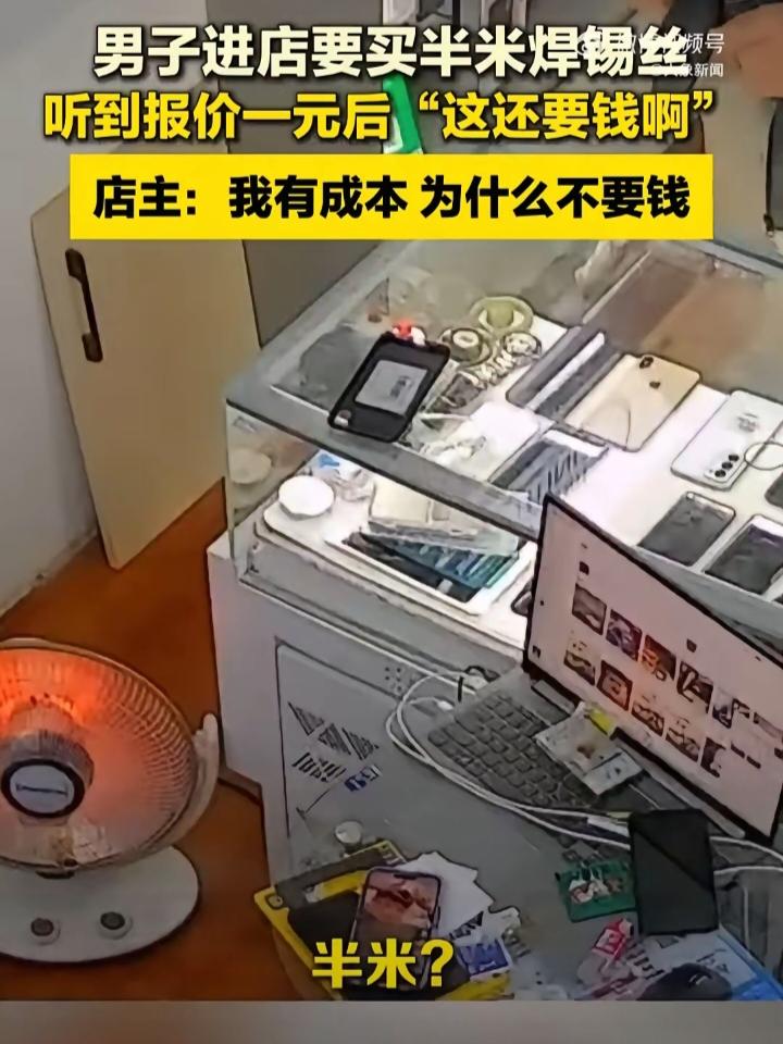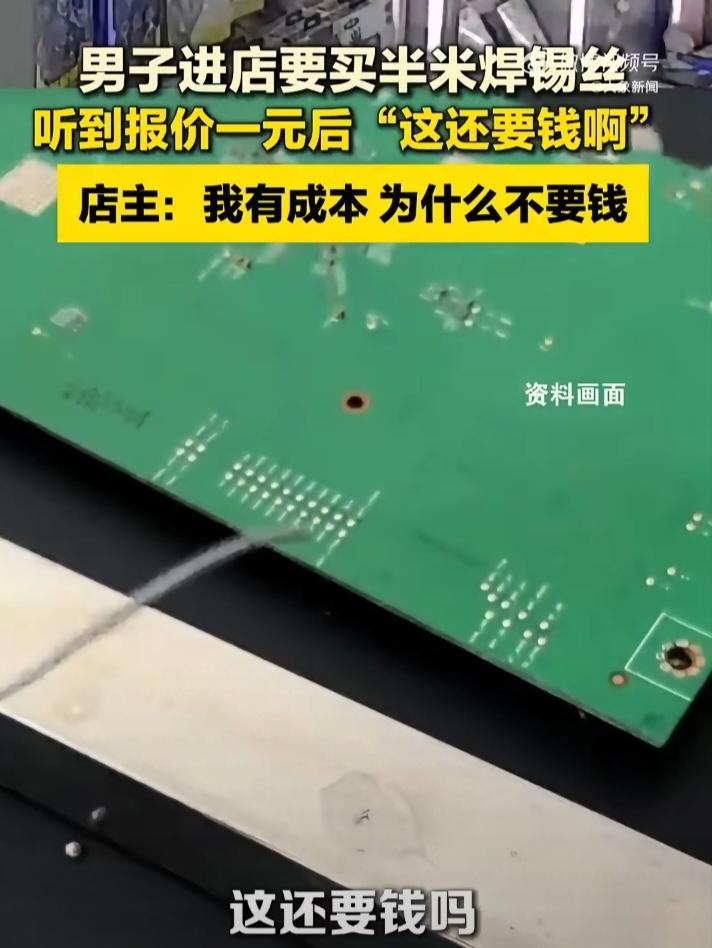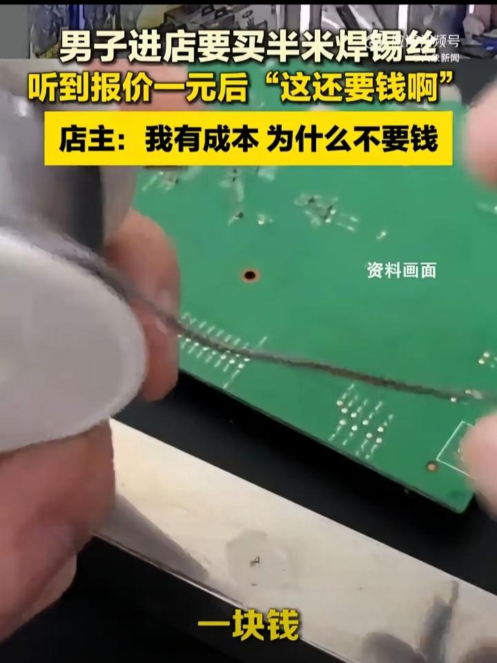 陕西一男子走进手机店,向店主索要焊锡丝:"麻烦你给我掐一点,只要半米,一卷我用不掉。""半米?""对,多了用不掉。" 店主扯出了半米:"一块钱。"男子满脸不可思议:"这么小点还要钱呀?"店主:"我这焊锡丝是进口的,专门用来焊接手机,几十块一卷,我有成本,为什么不收钱。" 男子:"那我就不要了。"随后转身离开。这段对话引起了网友热议,网友们一边倒地支持店主做法。成年人问出这种话也是醉了,人家进货也是要成本的,凭什么让你白嫖,你是他老爸啊? 这个店主算是有良心了,只收一元,既满足了你的要求,又不让你造成浪费。要我说要买就买一整卷,零散的不卖。买东西不想付钱,真是奇葩,你再去别家转转,看谁会免费送你。 一块钱都舍不得出,这人真是自私到家了,亏他还是个成年大男人。开店做买卖的都有房租和进货成本,不是做慈善的,半米焊锡丝收一块钱真不算贵,换作别的店家可能直接就拒绝零裁了。 总想着占别人小便宜,把别人的付出当成理所当然,这种想法真的让人没法认同。生活里总有人觉得东西少就该免费,完全不管商家的难处,占不到便宜还觉得自己受了委屈,这种心态实在要不得。尊重别人的劳动和成本,才是成年人最基本的处事道理。 各位读者你们怎么看?欢迎在评论区讨论。