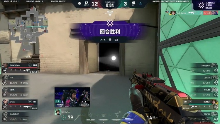 第十二局:XLG开局在A收下大狙,随后XLG想要提速但是G2回防已到,XLG两人面对2打3残局无法转点下包,G2拿下胜利