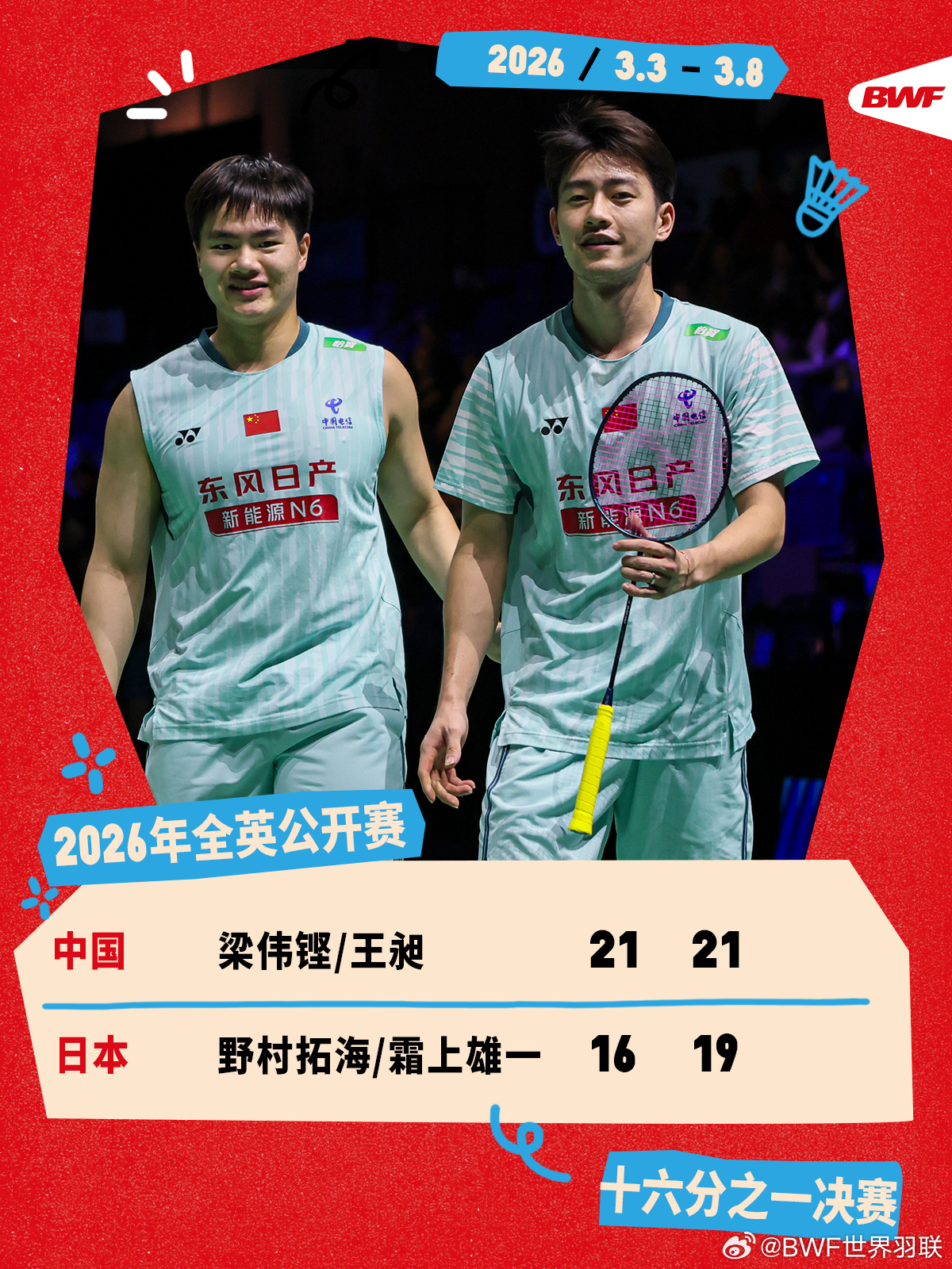 梁王组合次轮将对阵李哲辉/杨博轩#梁伟铿王昶2比0日本组合##2026全英羽毛球公开赛#