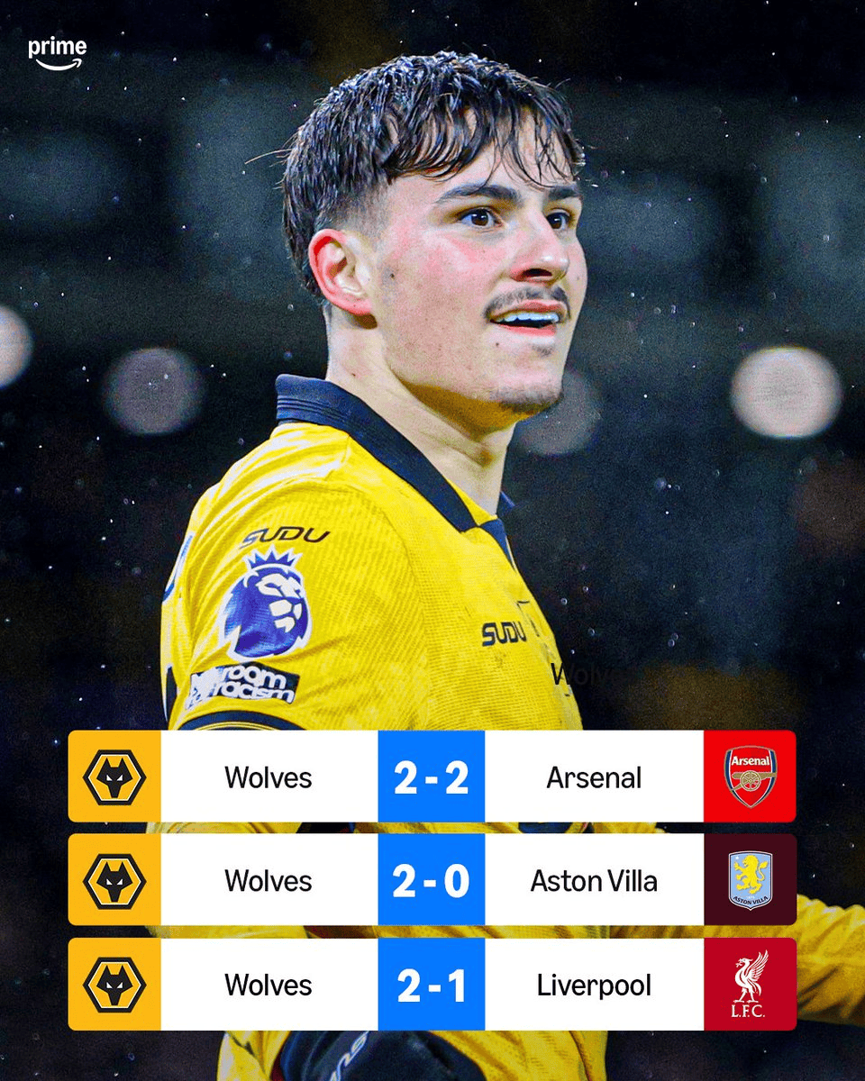 在过去半个月的英超联赛中,狼队已经连续在多支争冠集团球队身上拿到积分。他们先是在主场2-2战平阿森纳,随后2-0击败维拉,而本轮又2-1战胜利物浦。