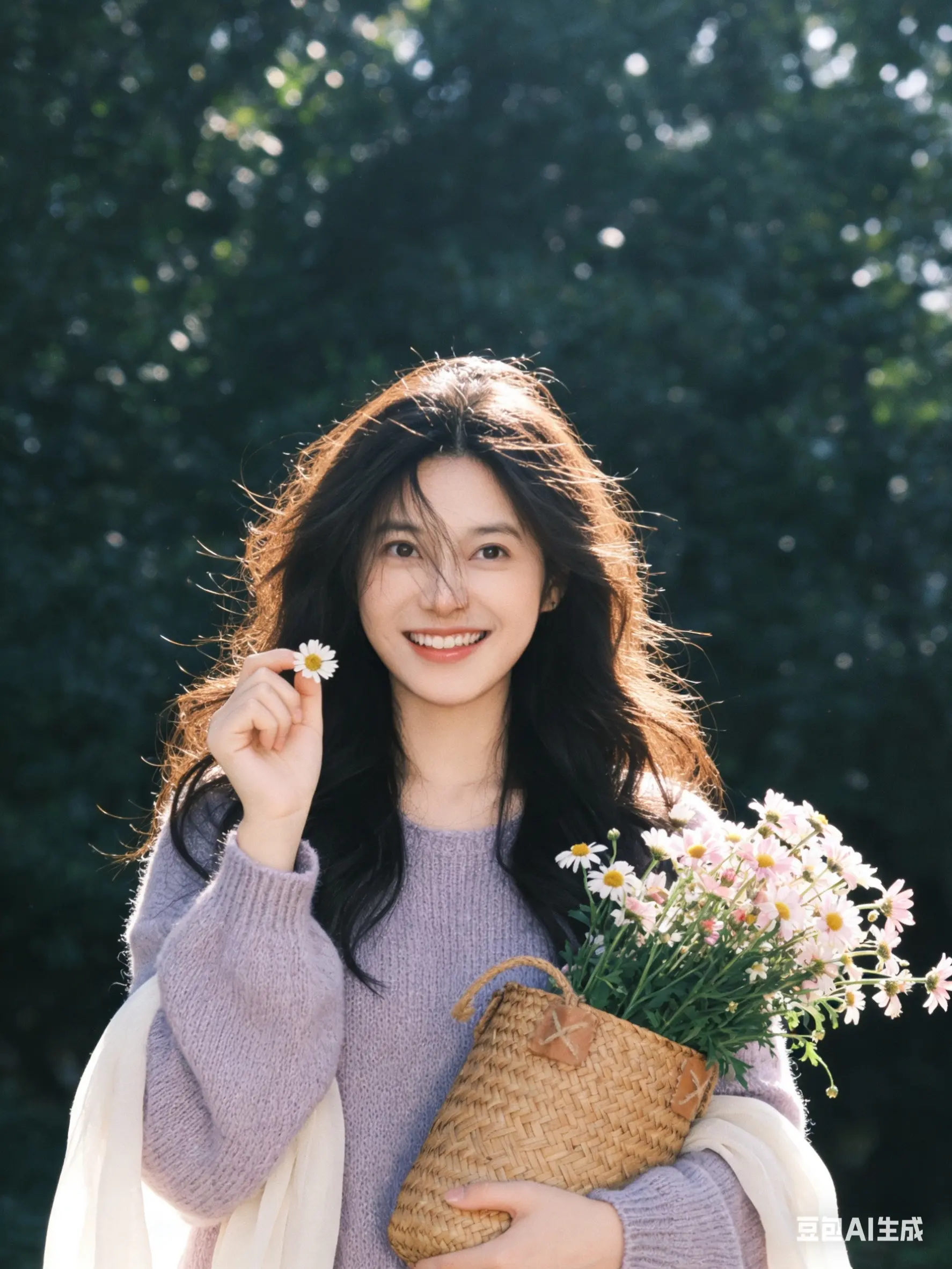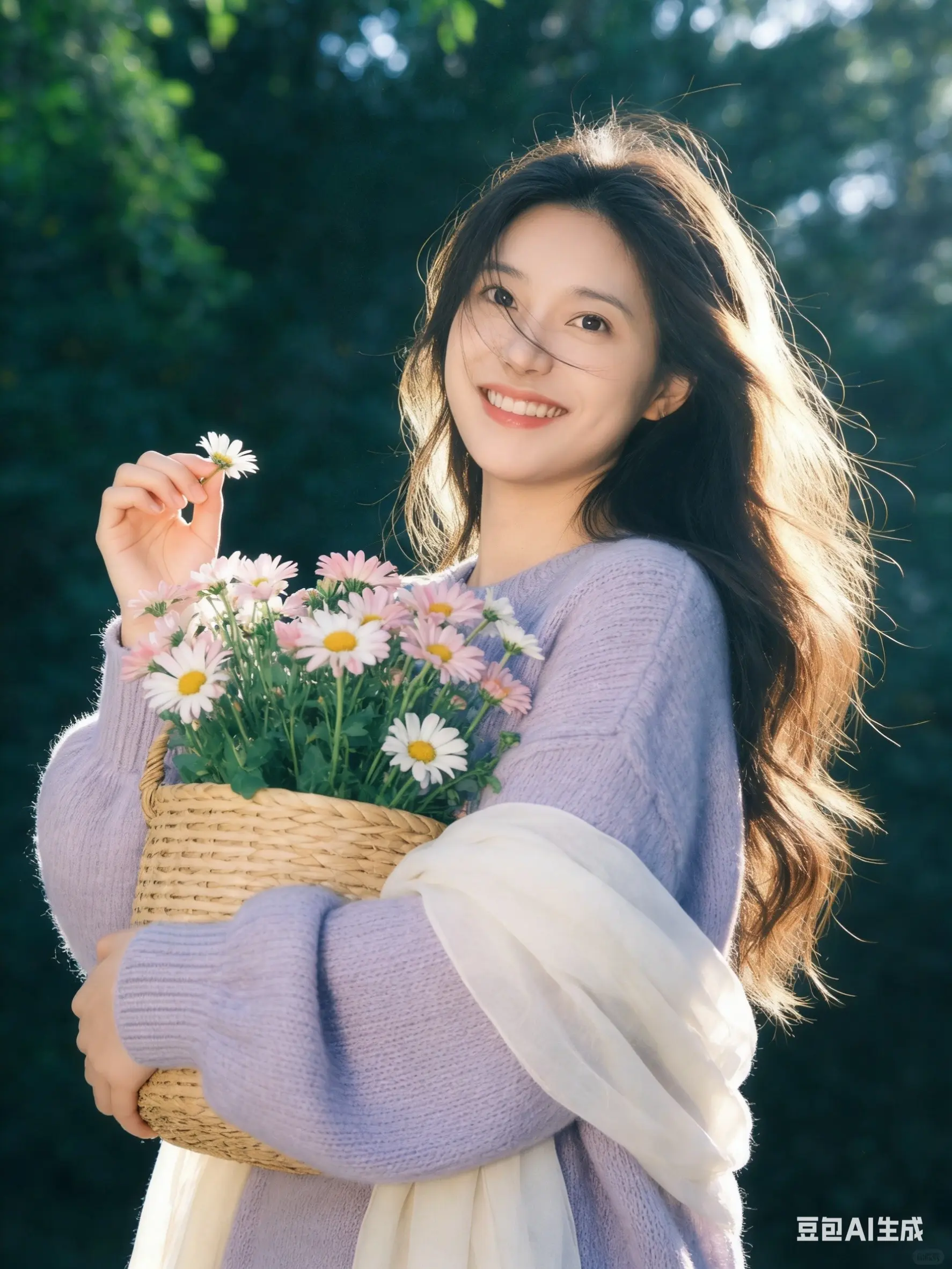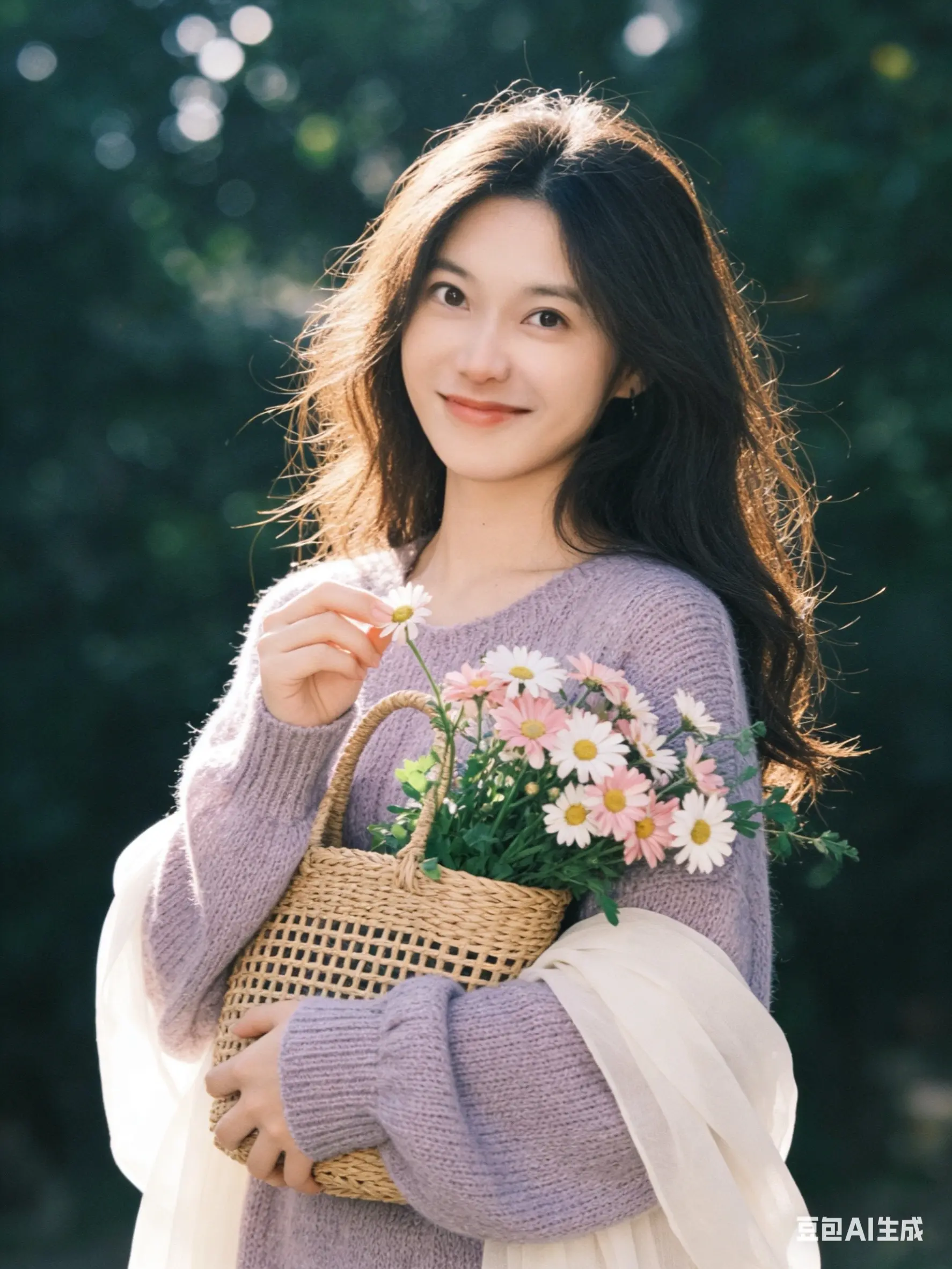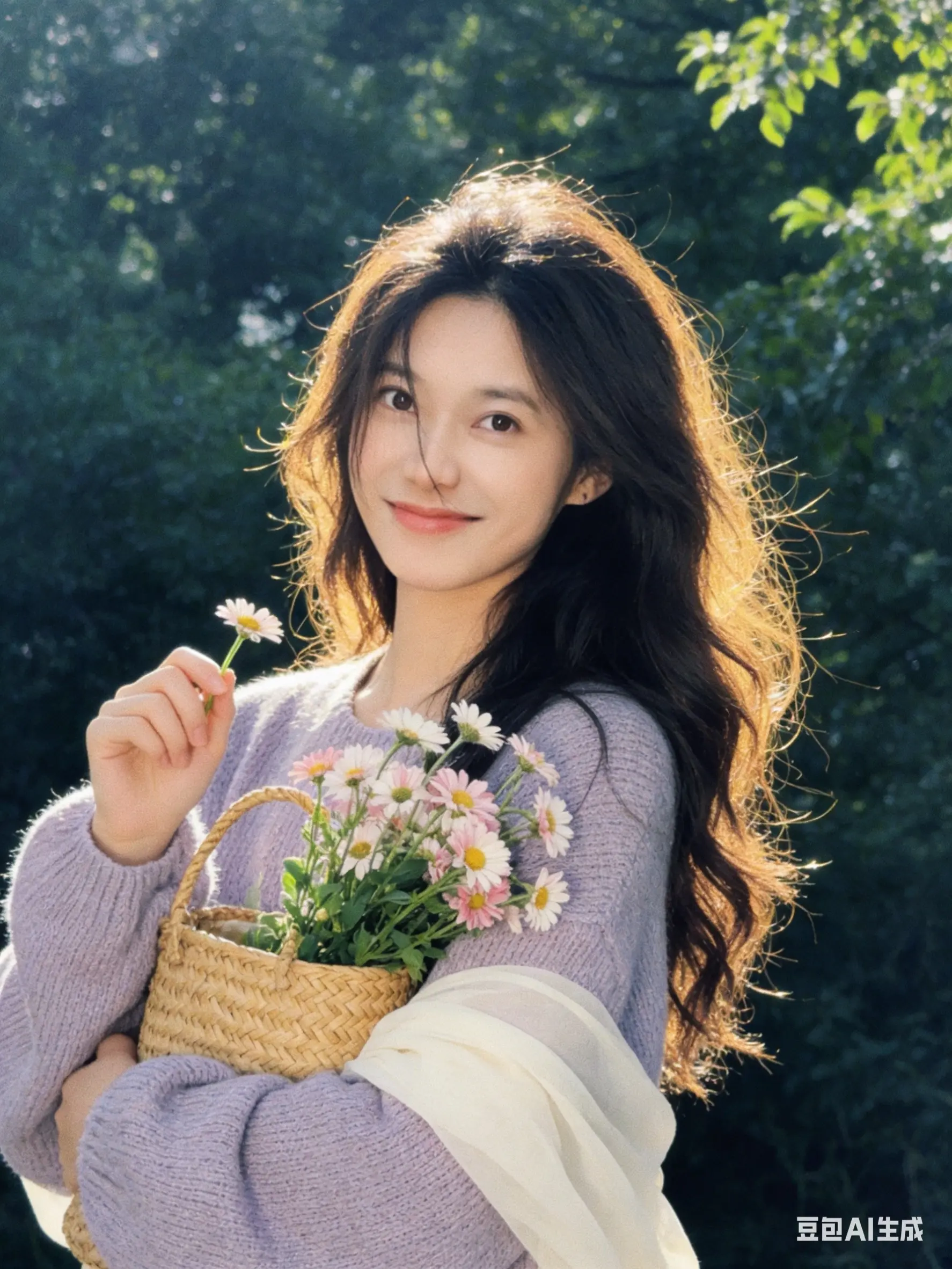 帮我生成10张照片,人物动作取景角度丰富:半身、全身、脸部近景、脸部特写;日系富土胶片风的人像写真,冷色调;部分照片微光打在飘起的发丝上,部分发丝杨在脸上,人物表情丰富,开心大笑,浅笑或放空;3:4比例高清写真,画面中一位年轻女性身着浅紫色宽松针织毛衣,质地柔软亲肤,搭配米白色轻薄披肩随意搭在肩头,增添了慵懒温柔的气质。她留着自然微卷的深棕色长发,发丝蓬松且带着自然的毛躁感,部分发丝被微风轻拂,随意地散落在脸颊与肩头,无刻意造型的松弛感。妆容清透自然,底妆轻薄服帖,眼妆以大地色晕染出柔和轮廓,唇色是淡粉裸调,整体呈现出原生感的元气。她的左手抱着一只编织草编篮,篮中盛放着粉白相间的小雏菊与绿色枝叶,右手轻捏一朵小雏菊,神情放松又治愈。背景是茂密的深绿色树林,枝叶繁茂,阳光透过叶隙形成斑驳的光影,空气里仿佛带着草木的清新气息。光线是温暖的午后侧逆光,柔和地勾勒出发丝的金色轮廓,营造出日系清新治愈的氛围,整体风格自然松弛,充满春日的鲜活与温柔。