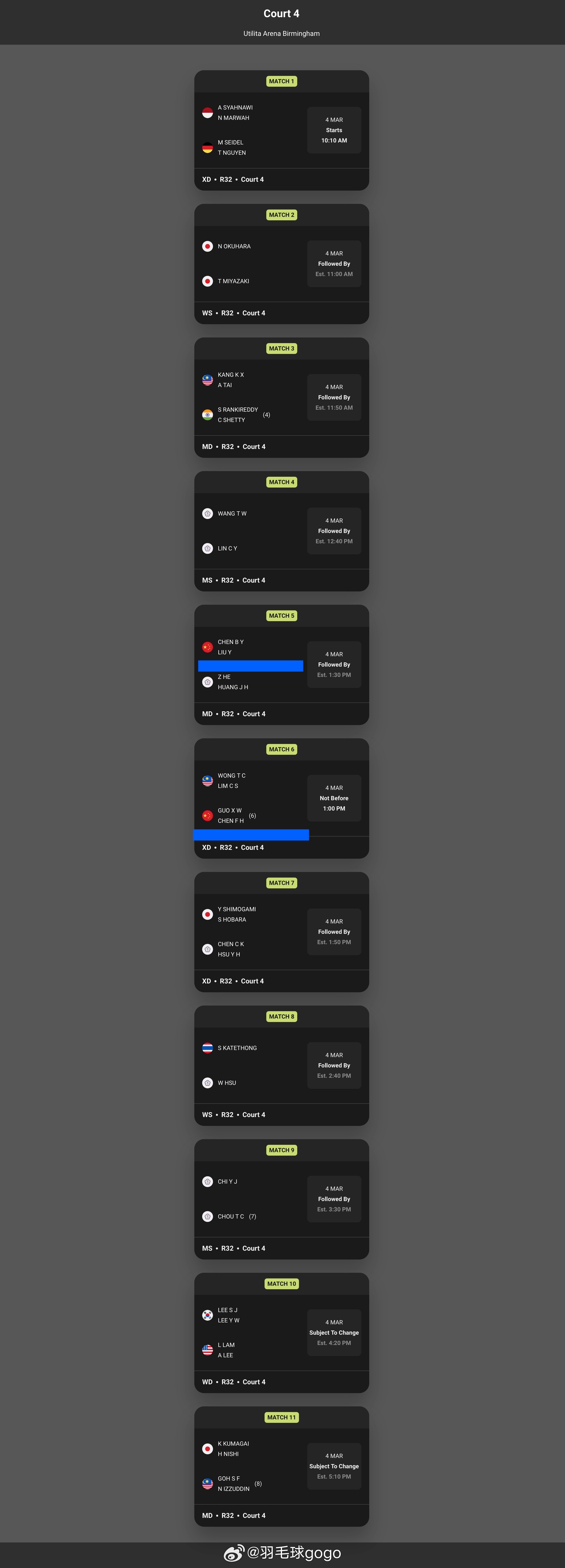2026全英羽毛球公开赛 3月4日第一轮国羽对阵:18点
