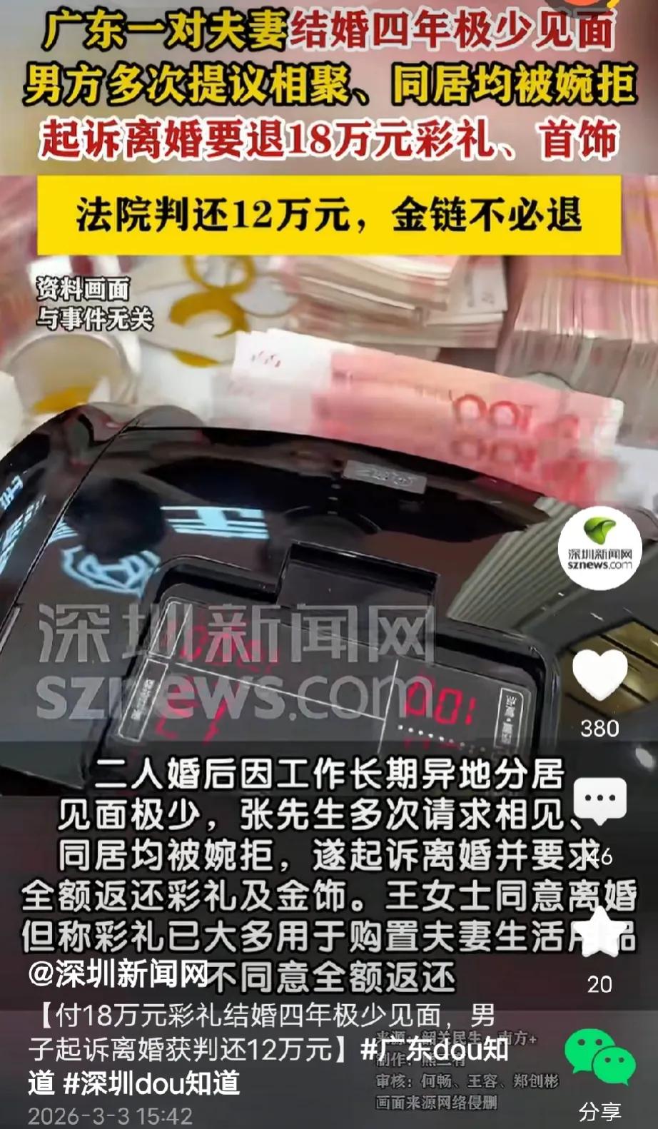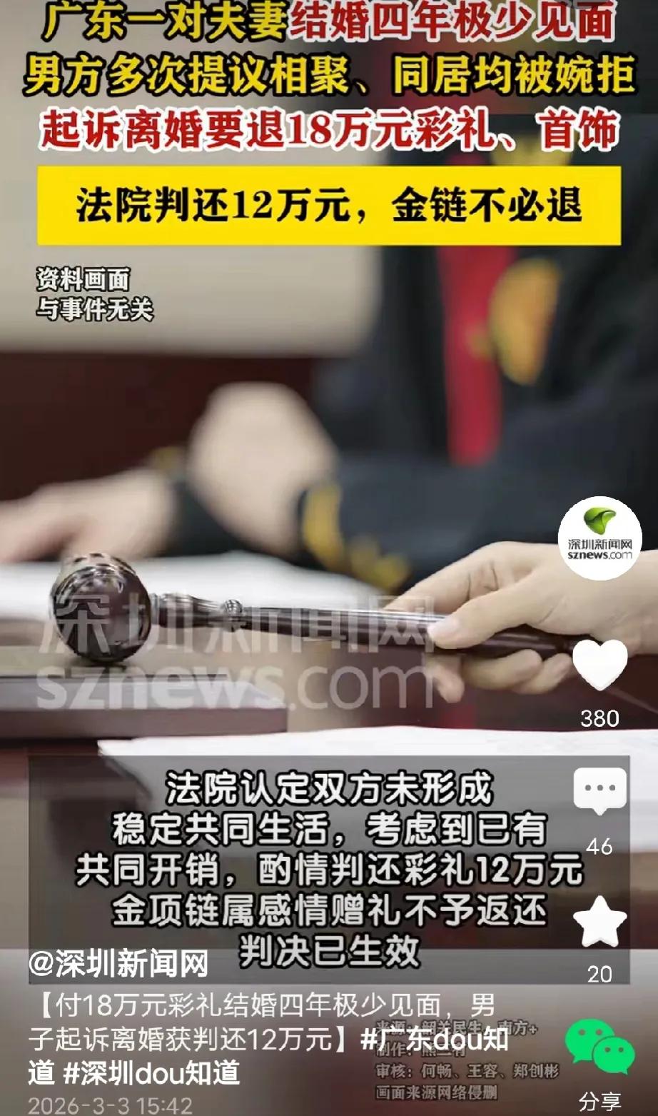 结个婚亏了8万!广东韶关,男子和女子结婚支付18万彩礼,赠送金项链等首饰,婚后,夫妻因工作分隔两地,结婚4年很少见面,男子多次提出跟女子相聚、同居,然而女子却不愿意,男子气得告上法庭,要求离婚并全额返还全部彩礼,法院判决让人意外。 2019年,张先生经人介绍认识李女士,因为两人早就到了结婚年龄,家里催的紧,所以两人仓促就把婚事办了。 结婚的时候,张先生家按照当地习俗支付给李女士18万彩礼,为了哄李女士开心还特地给她买了金项链等各种首饰。 结婚后,因为工作忙,两人没相处几天就分开各自忙于工作去了。 两人把婚事办了,父母也不催了,张先生和李女士都能安心地投入到各自的工作中。 本来两人婚前就没过多了解,也没什么感情基础,他们纯粹是为了结婚而结婚,婚后的生活自然淡如水。 当初张先生本想着,感情可以在结婚后慢慢培养,可李女士却不配合,即便是各种节假日,她能不跟张先生打照面的就尽量避免,能躲则躲,反正不自在。 为了培养感情,张先生多次提出跟李女士相聚,同居,可李女士总找各种理由拒绝,推脱。 不知不觉他们已经结婚4年了,可在张先生看来,别说培养感情了,见面的次数都很少,他跟单身没什么两样。 再多次提出同居都被李女士拒绝后,张先生失望了,他不再对这一段婚姻抱有希望,一颗心4年时间都捂不热,也别指望着以后能有什么改变。 思考再三,张先生起诉到法院,要求跟李女士离婚,并让她把18万元彩礼和金项链等首饰全部退回。 法庭上,李女士辩称,虽然他们很少住一起,但是结婚后,这些彩礼钱已经用在家庭的开支上,她没法退。 法院经过审理认为,两人虽然没有共同稳定生活,但是考虑到已经有部分共同开支,所以判定返还12万彩礼,其他的金项链等各种首饰属于赠送,不予返还。 网友看到这都炸了,这婚结得也太憋屈了吧!结婚四年,名义上是夫妻,实际上跟陌生人差不多,平时各过各的,连面都见不上几次,更别说一起过日子了。 男方本来想着先结婚后培养感情,一次次主动想凑到一起好好过日子,结果女方次次找借口躲着,摆明了就没打算好好过。 当初18万彩礼加金首饰,那都是男方真金白银拿出来的,普通家庭攒这么多钱不容易。 现在女方一句“花在家庭开支上了”就想一笔带过,可这四年俩人根本没怎么一起生活,哪来那么多家庭开销? 很多人都替男方不值,说这婚结得太亏了,钱花了,人没留住,日子也没过好,白白耽误四年时间。换谁遇上这种事,心里都得憋屈死,这哪是结婚,分明就是有名无实,最后还得自己扛损失。 有人说,这哪是结婚,分明就是结了个寂寞!当初砸进去18万彩礼、再加金项链首饰差不多20万砸进去,结果四年有名无实,连正常夫妻日子都没过过几天。 最后算下来,彩礼只退了一部分,里里外外男方硬生生亏了大概8万块钱!时间耗了四年,钱也没了,感情更是一点没捞着。 依据《最高人民法院关于适用〈民法典〉婚姻家庭编的解释(一)》第5条规定,双方办理结婚登记手续但确未共同生活,离婚时当事人请求返还彩礼的,人民法院应当予以支持。 回到这个事件,两人登记结婚4年但长期分居,女方多次拒绝共同生活,属于确未共同生活的情形,符合返还彩礼的法定条件,法院结合少量共同开支酌情返还12万彩礼。 而金项链等首饰是男方自愿赠送的,依法不用退还,这样的判决既符合法律规定,也考虑到了现实情况,合情合理。 对此,你们怎么看?