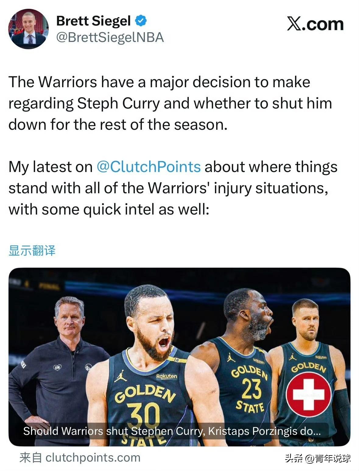 勇士队面临重大抉择! 据NBA权威记者Brett Siegel报道:勇士队正在做一个非常艰难的抉择,那就是要不要让库里赛季报销,以彻底修养好他的膝盖伤。 截止目前,库里膝盖伤(右膝髌骨疼痛综合症)已经缺席了数10场比赛,他还将继续缺席至少4场比赛,仍然没有具体的复出时间。再加上波尔津吉斯也遭遇了棘手的疾病困扰,巴特勒已经赛季报销,库里为勇士队本赛季继续拼下去似乎已经没有任何意义。 勇士队最新战绩为31胜30负,排名西部第8位,附加赛已经基本上无法避免!