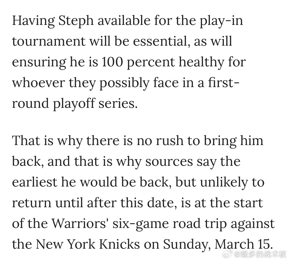 库里健康出战附加赛对球队至关重要,这就是勇士不急于让库里复出的原因,他最快复出时间是3月15日对尼克斯,但那一天复出的可能性不大。