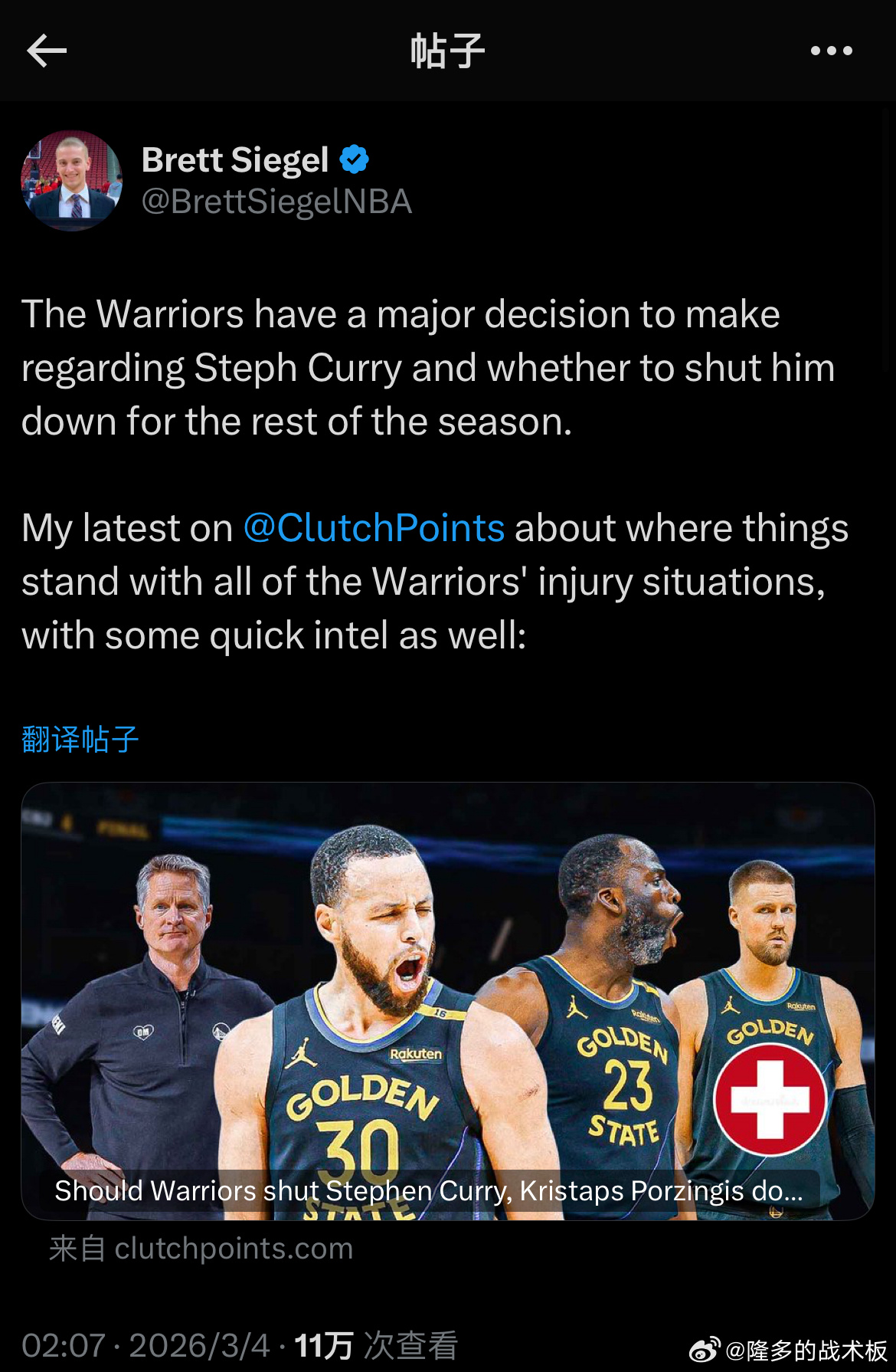 正文写道:截至目前,勇士方面完全没有讨论过让库里赛季报销,而且据消息源透露,库里本人明确希望在季后赛前复出,为球队争取一些势头。