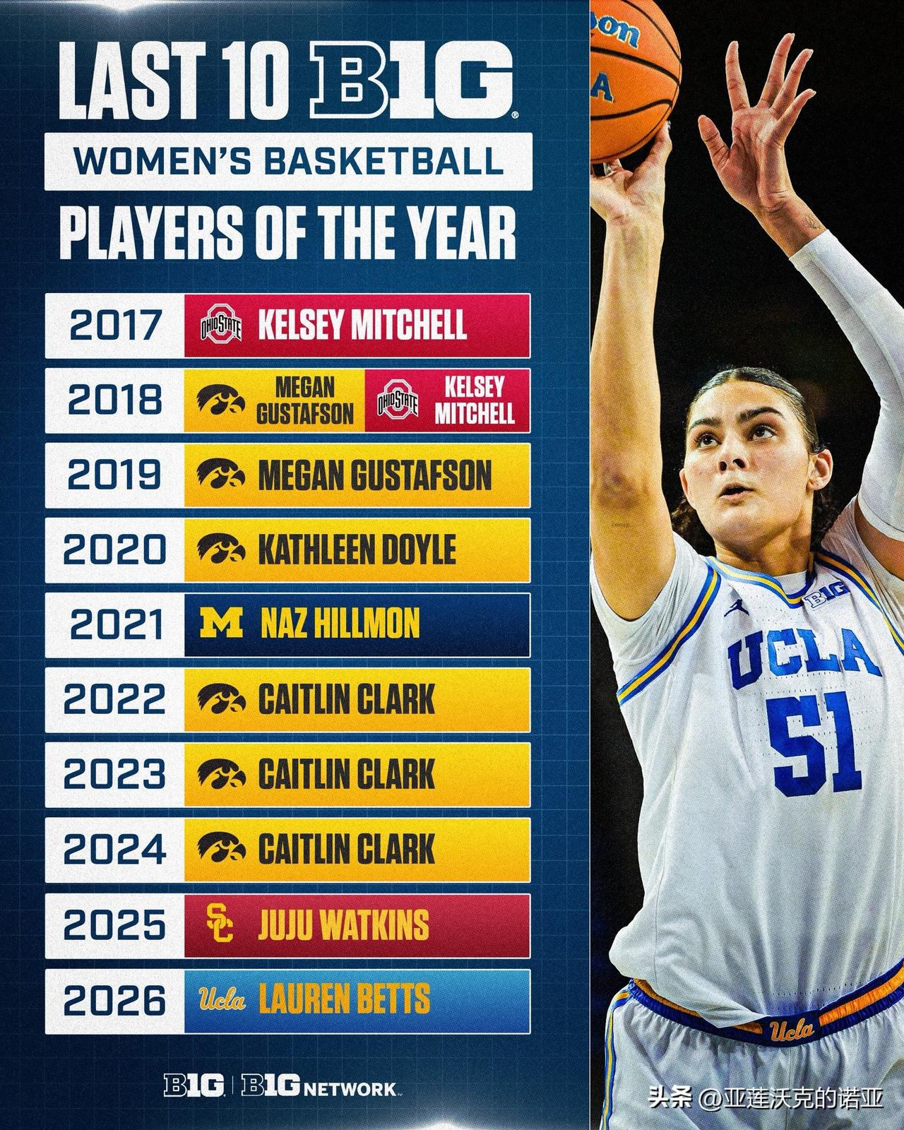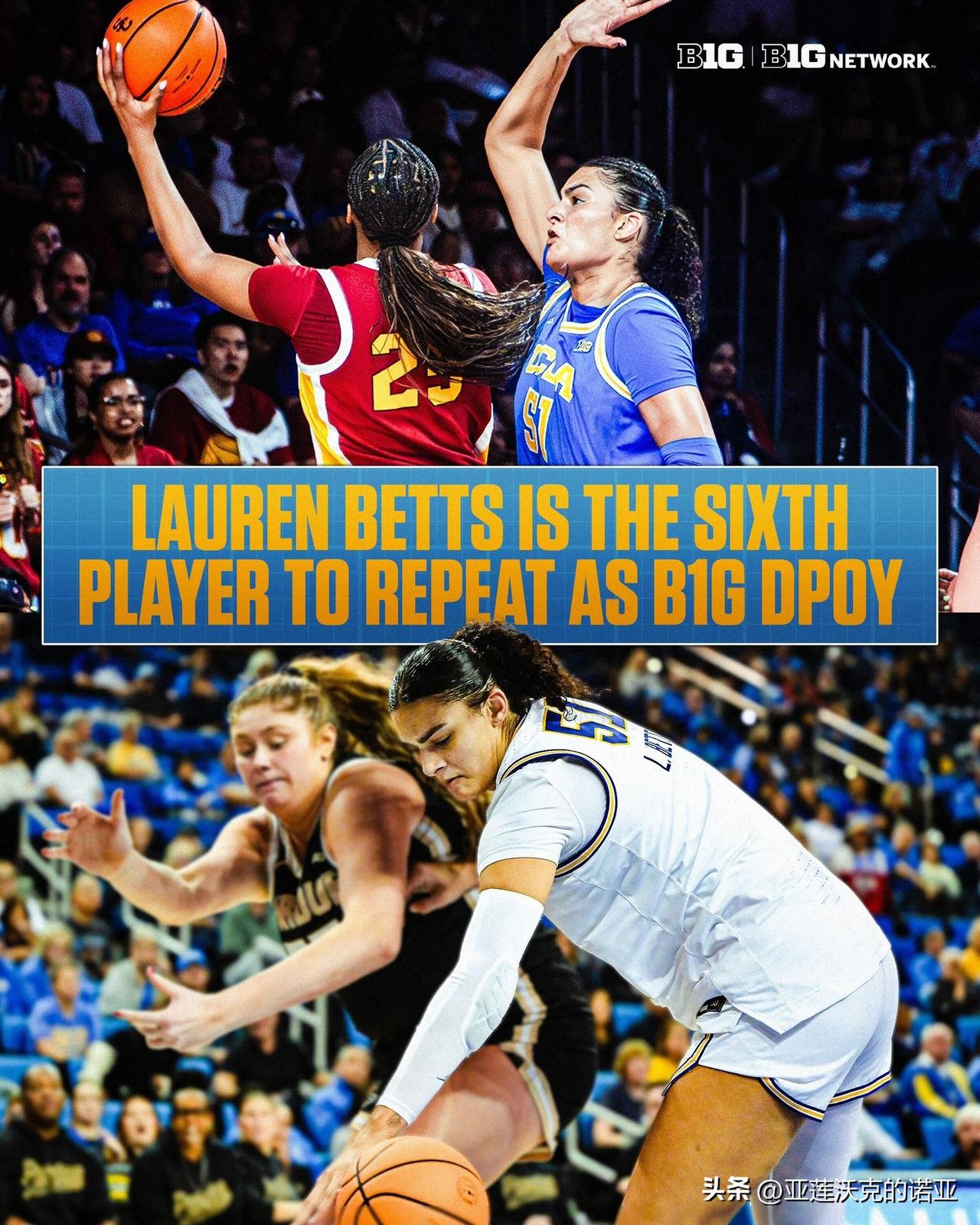 UCLA中锋Lauren Betts成为首位包揽Big Ten联盟年度最佳球员和年度最佳防守球员的人,贝茨之前谈到她在斯坦福期间所面临的心理健康挑战以及转学至UCLA时说,当我离开斯坦福的时候,我甚至觉得我可能再也打不了篮球了,当我加盟UCLA时,我是抱着治愈自己的目的来到这里的。