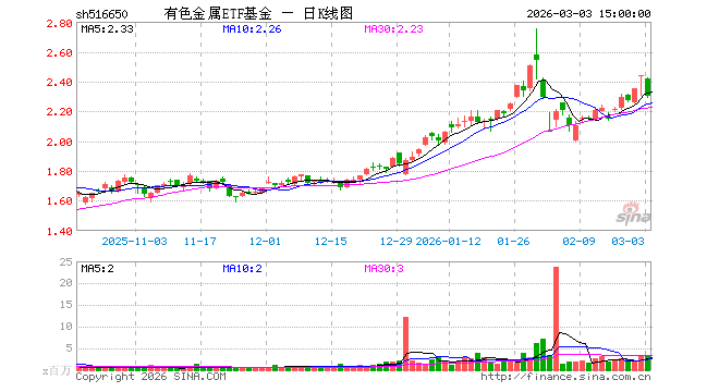 3月3日,有色金属ETF基金(516650)跌5.54%,成交额8.28亿元。当日份额增加1.86亿份,最新份额为75.56亿份,近20个交易日份额减少2.40亿份。最新资产净值计算值为173.53亿元。