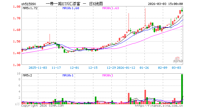 3月3日,一带一路ETF汇添富(515990)跌0.57%,成交额1733.23万元。当日份额增加200.00万份,最新份额为6335.02万份,近20个交易日份额增加100.00万份。最新资产净值计算值为1.11亿元。