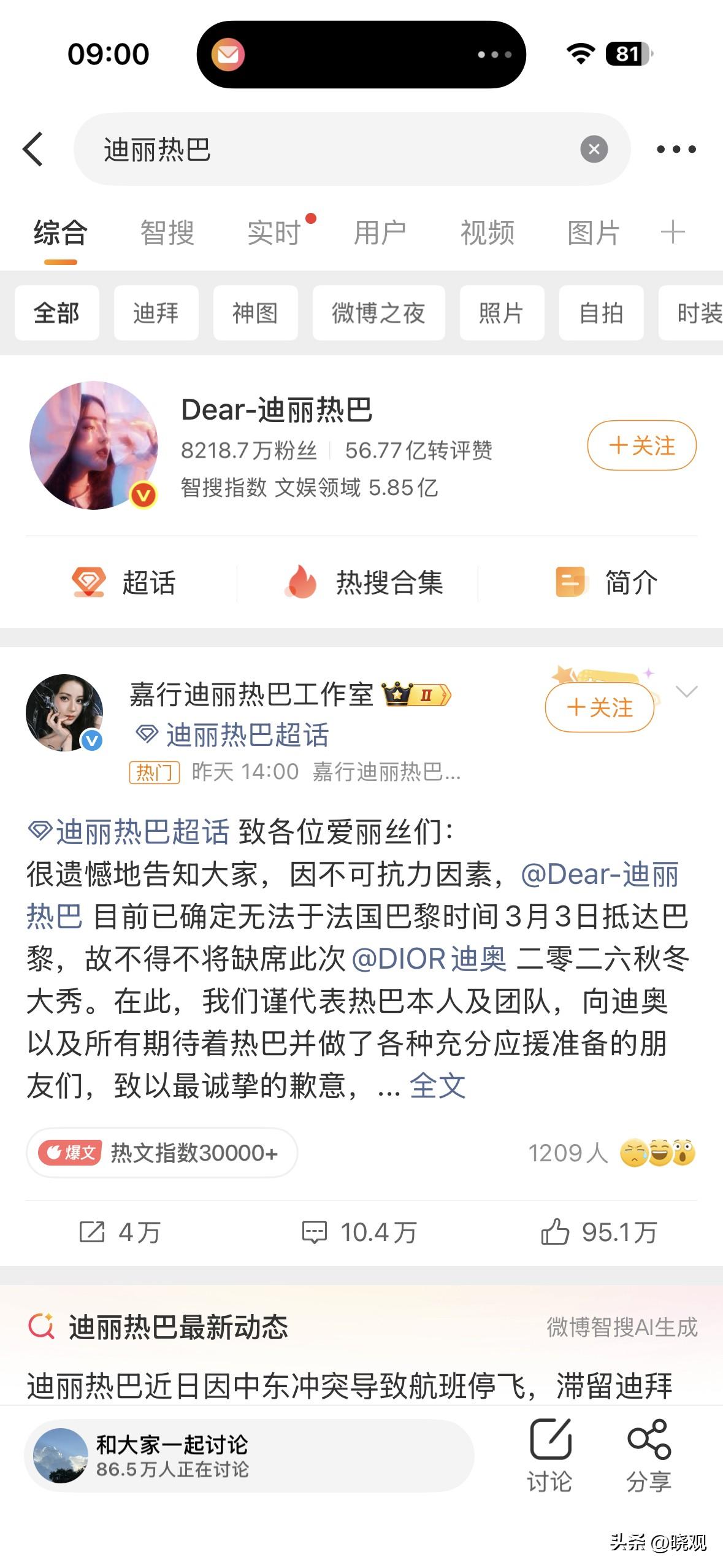 一大早特意看有没有迪丽热巴滞留迪拜的最新消息,结果没有。 迪丽热巴原计划经迪拜转机赴巴黎参加Dior 2026秋冬大秀,因中东冲突(伊朗反击,美以行动后迪拜机场受损、航班大停飞)滞留,无法按时抵达,已缺席。 工作室3日声明“不可抗力”,确认她一切平安、与团队互相照应。 “团队全直飞只留她一人”“隐瞒3天”等是网友传闻,粉丝不满行程安排,但官方未证实失误。安全第一。 热巴仍在迪拜,迪拜今天啥情况啊?