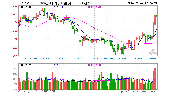 3月4日,300红利低波ETF嘉实(515300)开盘涨0.00%,报1.357元。300红利低波ETF嘉实(515300)重仓股方面,中国神华开盘跌1.77%,格力电器跌0.24%,中国石油涨4.11%,中国石化涨3.58%,双汇发展跌0.26%,中国海油涨2.51%,大秦铁路跌0.38%,中国建筑跌0.40%,招商公路跌0.31%,美的集团跌0.73%。
