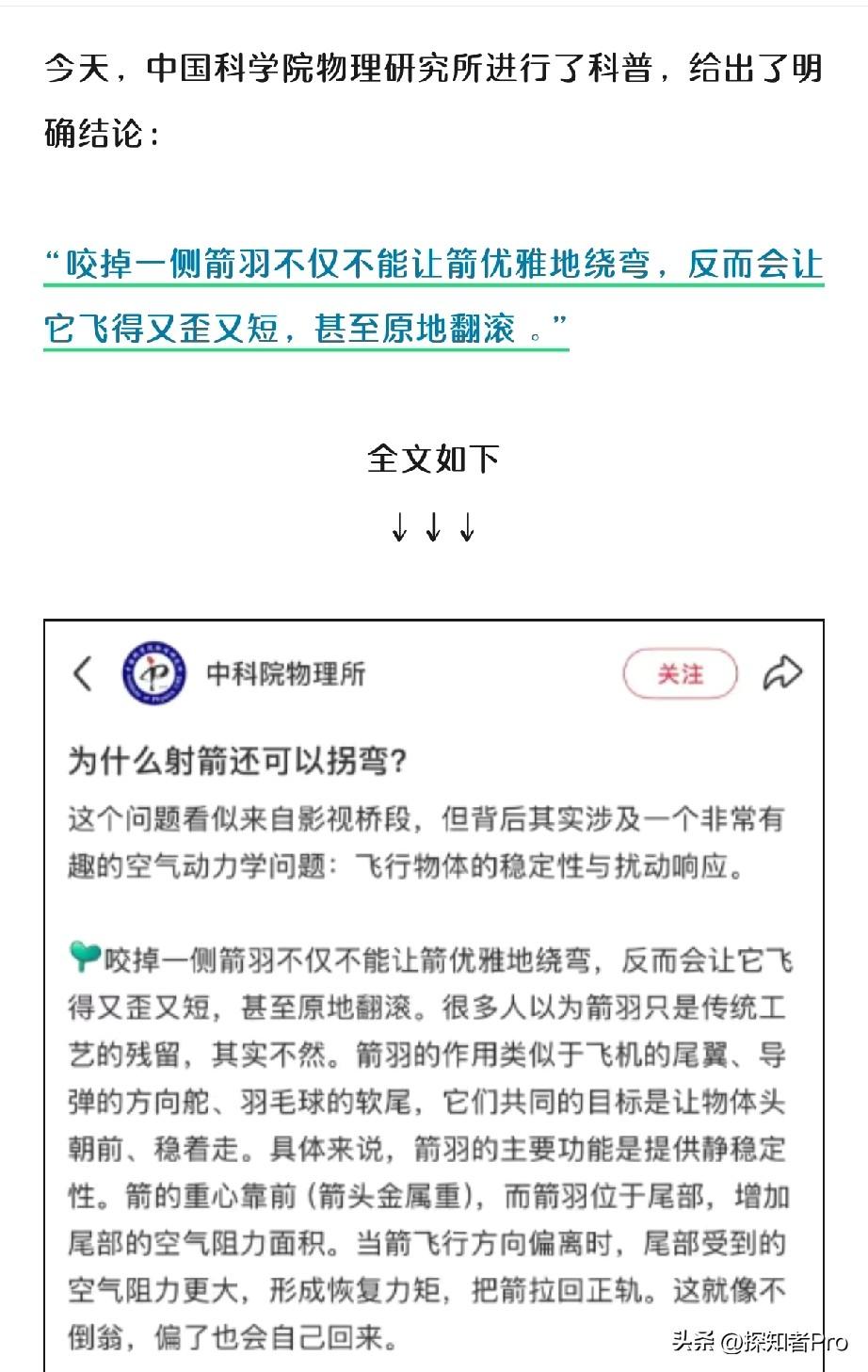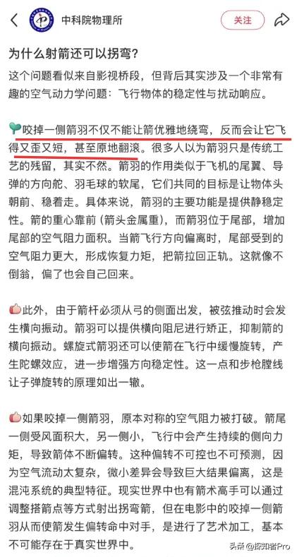 电影《镖人》“拐弯箭”引起热议 看了 中国科学院物理所 的科学分析回应 网友直呼:又被影视剧情刷新认知,差点被这支“拐弯箭”给忽悠“拐弯”了... 《镖人》中有一个经典片段:陈丽君咬掉箭羽射出了自带追踪导航的“拐弯箭”。 这一箭,不但射中了电影角色中的仇人,更是射中了影迷观众的好奇心→【咬掉一侧箭羽能不能射出拐弯箭?】 随着好奇心而来的便是网友的热议讨论,甚至有网友亲自下场验证,“复制”出了箭转弯的效果。 而中国科学院物理研究所也给了回应,为我们进行了科学分析的知识普及→ 【咬掉一侧箭羽不仅不能让箭优雅地绕弯,反而会让它飞得又歪又短,甚至原地翻滚。】 看到这科普知识,有网友直呼:又被影视剧本带偏认知和常识,差点被这支“拐弯箭”给忽悠“拐弯”了... 也有网友认为: →影视娱乐,纯属虚构,娱乐一下就好,不必都真的把它全当真... →影视虽是虚构,但也要尊重科学和常识,不能把常识、科学现象当儿戏呀。 特别是小朋友影迷观众,甄别是非能力还不成熟,他们看到后,把这“虚构的科学、常识”当真也不足为奇! 你认为影视剧需要更贴近现实生活,剧情设定要尊重科学和常识吗?评论区说说
