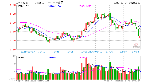 3月4日,机器人ETF易方达(159530)开盘跌1.58%,报1.430元。机器人ETF易方达(159530)重仓股方面,绿的谐波开盘跌0.32%,双环传动跌2.45%,机器人跌0.06%,石头科技跌0.84%,科沃斯跌0.60%,三花智控跌1.35%,拓普集团跌1.19%,鸣志电器跌1.61%,领益智造跌2.04%,科大讯飞跌1.32%。