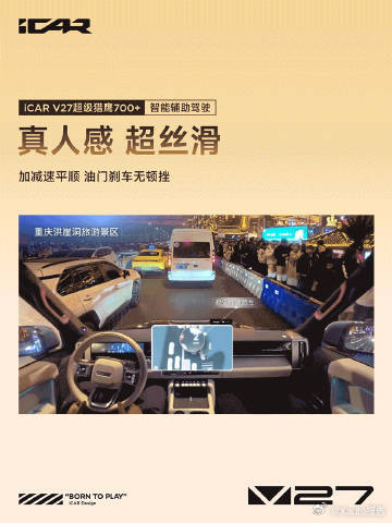 V27智驾第一梯队稳了iCAR V27定档3月13日全能上市,定位家庭硬派方盒子SUV。3月3日举办技术发布会,联合地平线打造超级猎鹰700+智驾,搭载560TOPS算力芯片与27颗传感器,支持全场景领航与智驾漫游。车型采用经典方正设计,空间宽敞实用;配备黄金增程、MRC磁霸悬架与高刚性车身,兼顾动力、操控与安全,智驾实力稳居第一梯队。地平线HSD方盒子智驾新标杆iCARV27V27全能硬派全家都爱