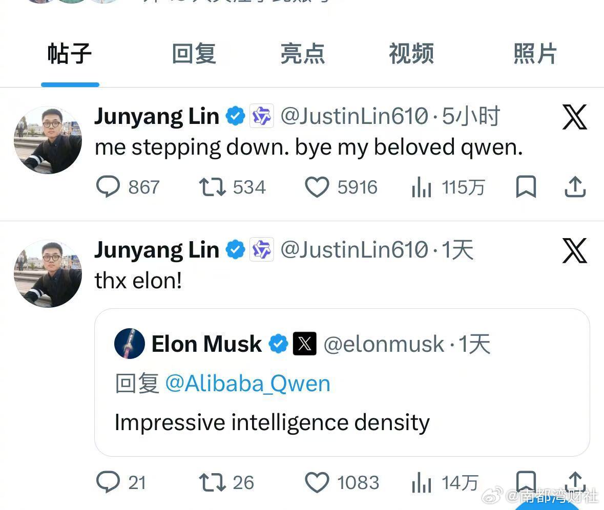 【#千问技术负责人林俊旸自宣卸任#】#林俊旸宣布离开阿里千问# 3月3日夜间,阿里千问大模型技术负责人林俊旸自宣卸任,他在社交平台写道“me stepping down. bye my beloved qwen.”(我将卸任,再见我亲爱的千问)。作为阿里千问大模型的技术核心人物,林俊旸或将离开千问团队,目前尚不知他是否会离开阿里巴巴。记者就此消息向阿里巴巴求证,截至发稿暂未获得回复。(第一财经)