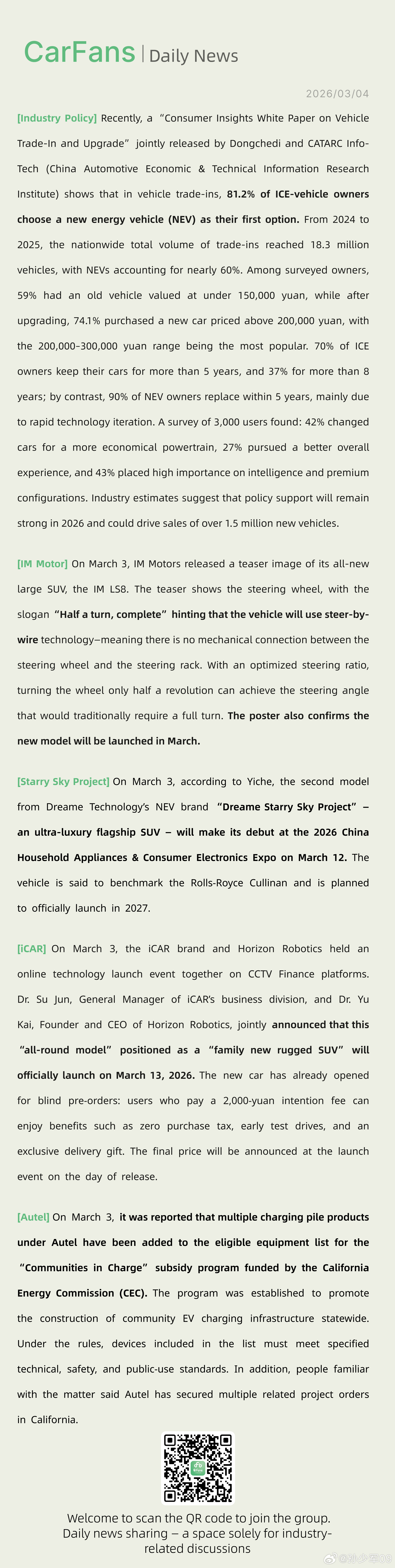 汽车置换中81.2%燃油车用户首选新能源、道通旗下充电桩进入由美国加州补贴设备清单懂车帝联合中汽信科发布《汽车以旧换新消费洞察白皮》显示汽车置换中81.2%燃油车用户首选新能源,2024至2025年全国以旧换新总量1830万辆,新能源车型占比近六成。