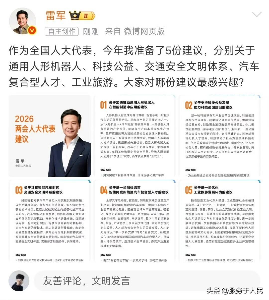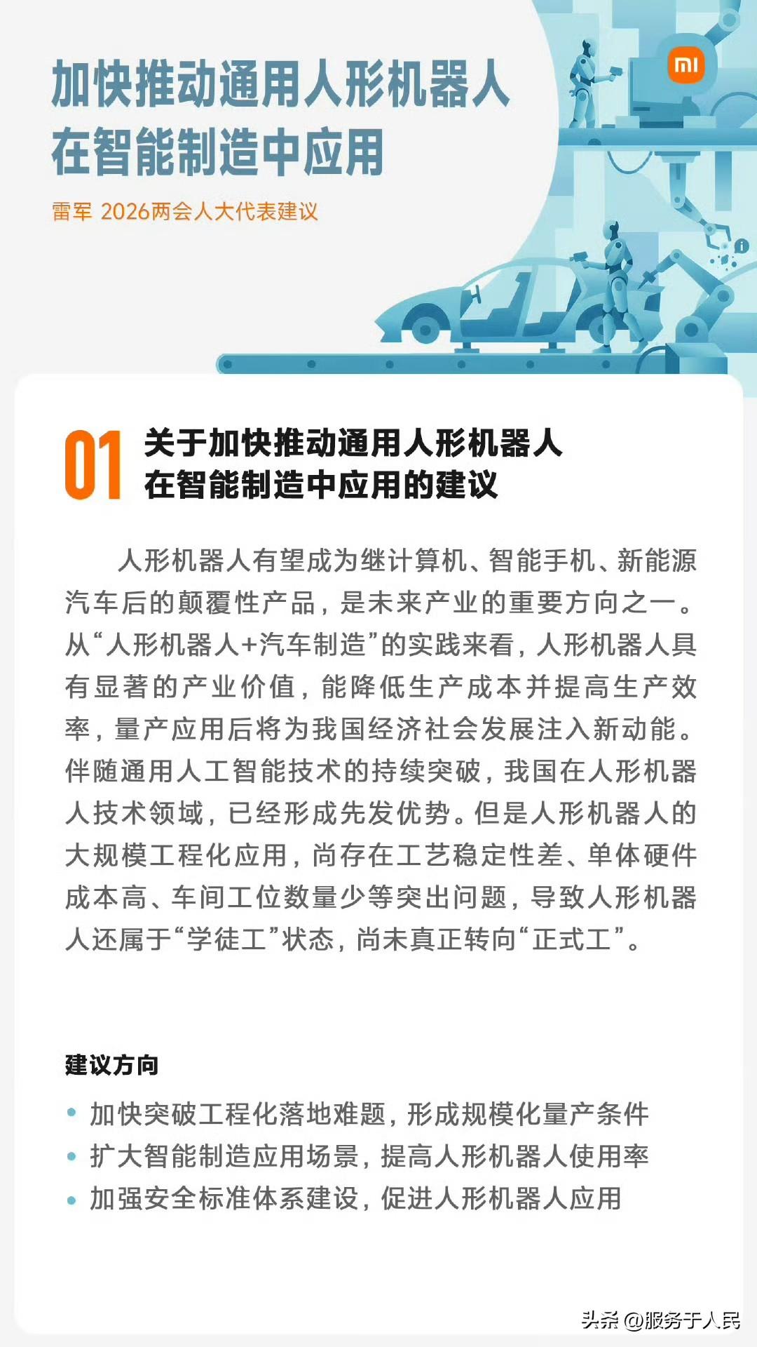 🔥雷军作为全国人大代表,今年准备了5份务实且前瞻的建议,聚焦通用人形机器人、科技公益、交通安全文明体系、工业旅游及汽车复合型人才培养。其中,“关于加快推动通用人形机器人在智能制造中应用的建议”最具突破性。 当前,我国人形机器人虽在技术上取得优势,但仍面临工艺稳定性差、单体硬件成本高、车间工位数量少等“工程化落地难”问题,导致其多处于“学徒工”状态,难以大规模“转正”。雷军建议加快突破这些瓶颈,形成规模化量产条件,这不仅是技术升级,更是制造业提升效率、保障安全的必然选择。 作为小米创始人,他结合自身在机器人领域的实践,使建议更具可操作性。若能落地,将带动上下游产业链发展,为实体经济注入新动能,推动我国从“制造大国”向“智造强国”迈进。其他建议如科技公益、交通安全等,也体现了他对社会民生与产业发展的双重关切。这些议题若能实质性推进,将对科技进步和经济转型产生深远影响。