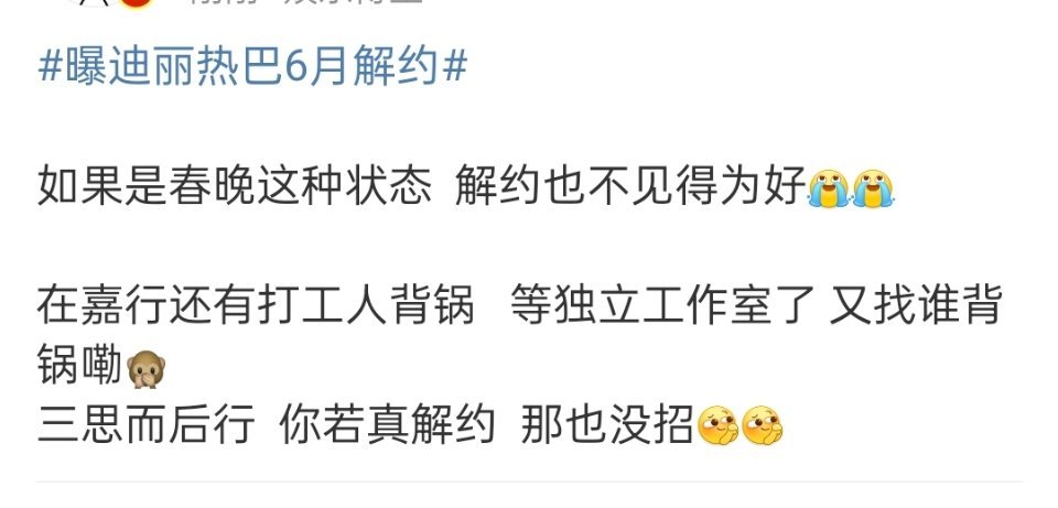 曝迪丽热巴6月解约有网友表示,不看好她解约以后的发展,在嘉行还有打工人背锅,等独