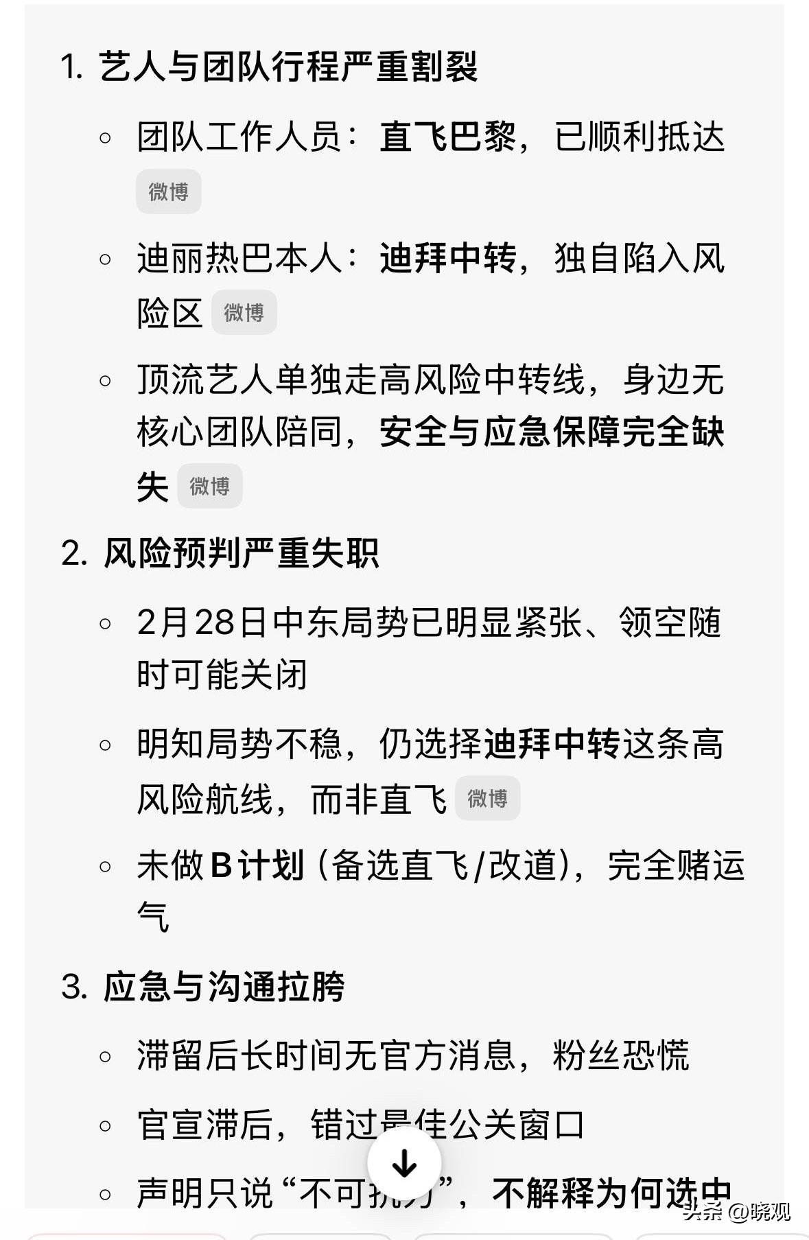 迪丽热巴工作室官微炸毛了,网友呼吁所有人辞职,追问迪丽热巴现在到底在哪儿??要姐姐本人出来报平安!!! 此次行程安排非常不正常,团队直飞,迪丽热巴一个人转机高风险区域。 背后必定有原因。