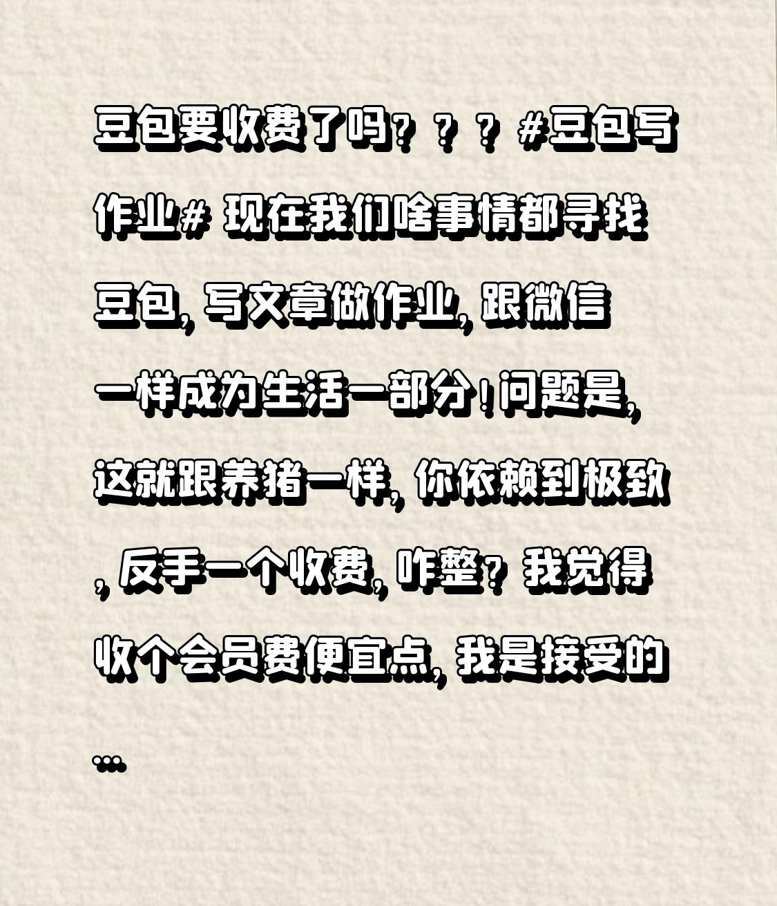 豆包要收费了吗???豆包写作业 豆老师🧑🏫 现在我们啥事情都寻找豆包, 写文章做作业, 跟微信一样成为生活一部分! 问题是, 这就跟养猪一样, 你依赖到极致, 反手一个收费, 咋整? 我觉得收个会员费[捂脸][捂脸][捂脸] 便宜点, 我是接受的[捂脸]