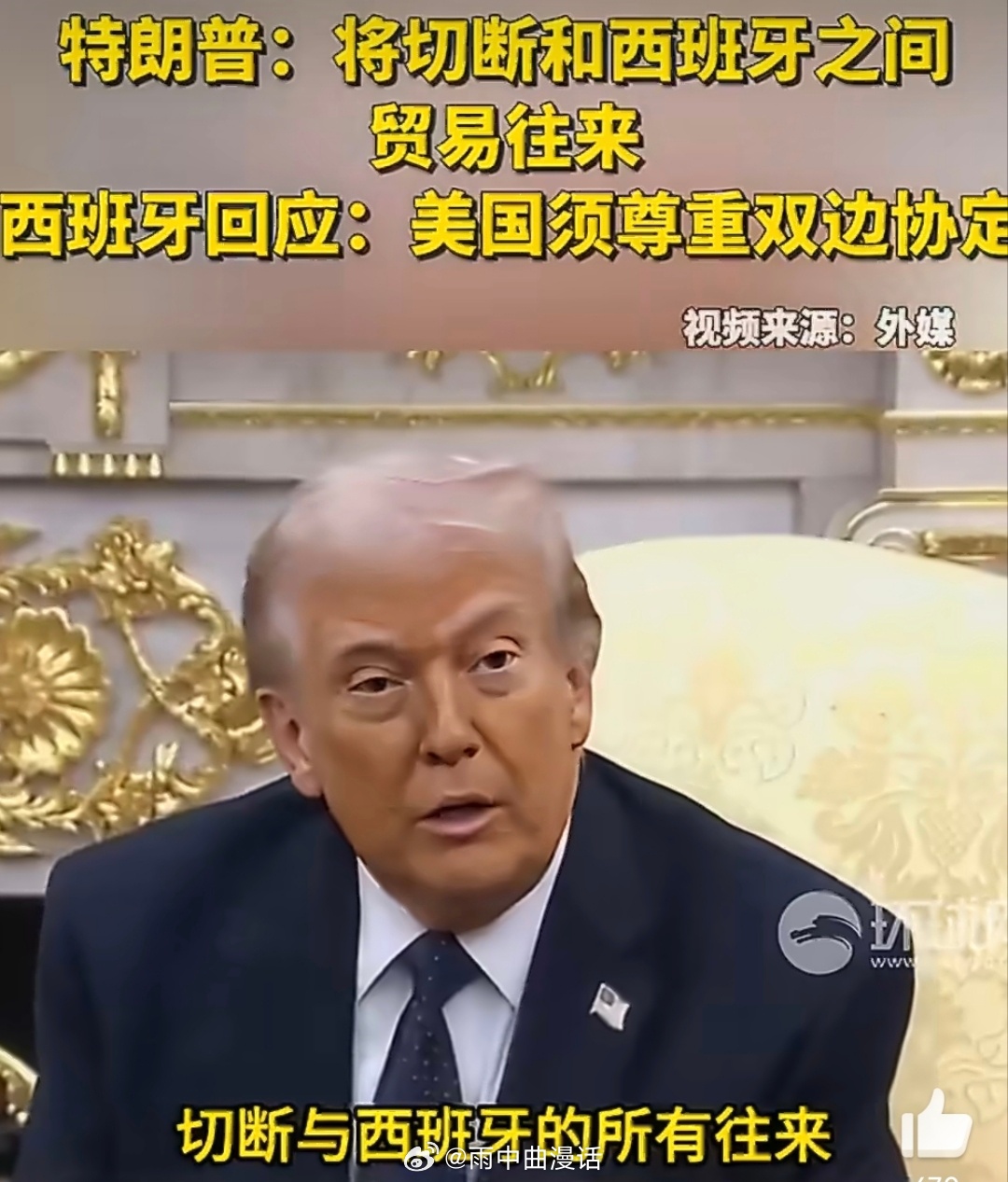 特朗普威胁西班牙特朗普威胁西班牙,本质是把单边意志凌驾于国际法与双边协定之上。西班牙作为主权国家,有权决定军事基地用途,有权自主判断国际冲突立场。美国以“盟友”之名行胁迫之实,破坏互信,撕裂同盟。这种动辄毁约、极限施压的做法,冲击全球经贸秩序,也让世界看清霸权主义的真实面目,不得人心。