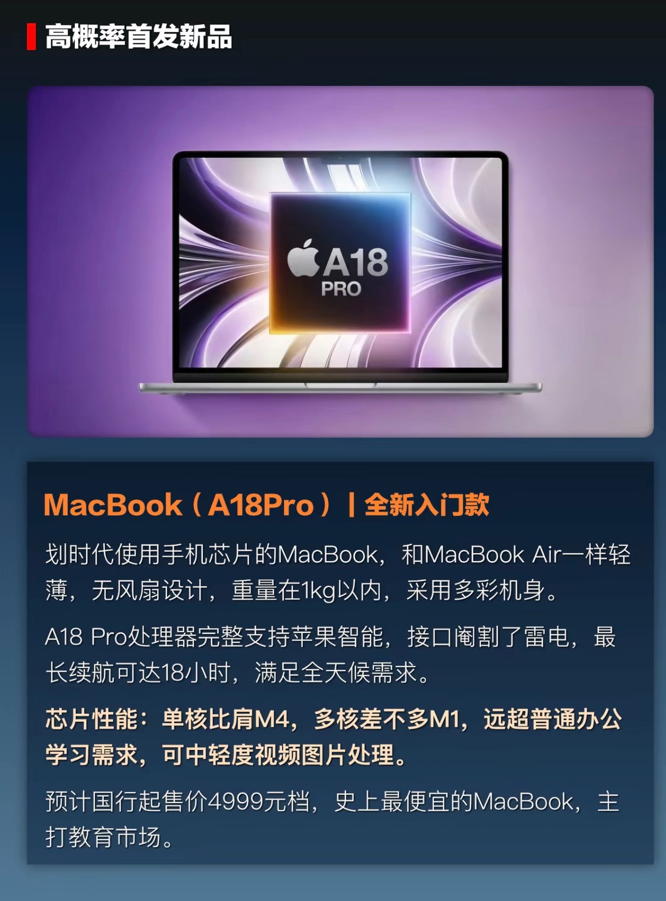 今晚苹果还会有个新品,大概率是传闻的 Macbook Neo,一个搭载 A18 Pro 的处理器的平价版电脑。