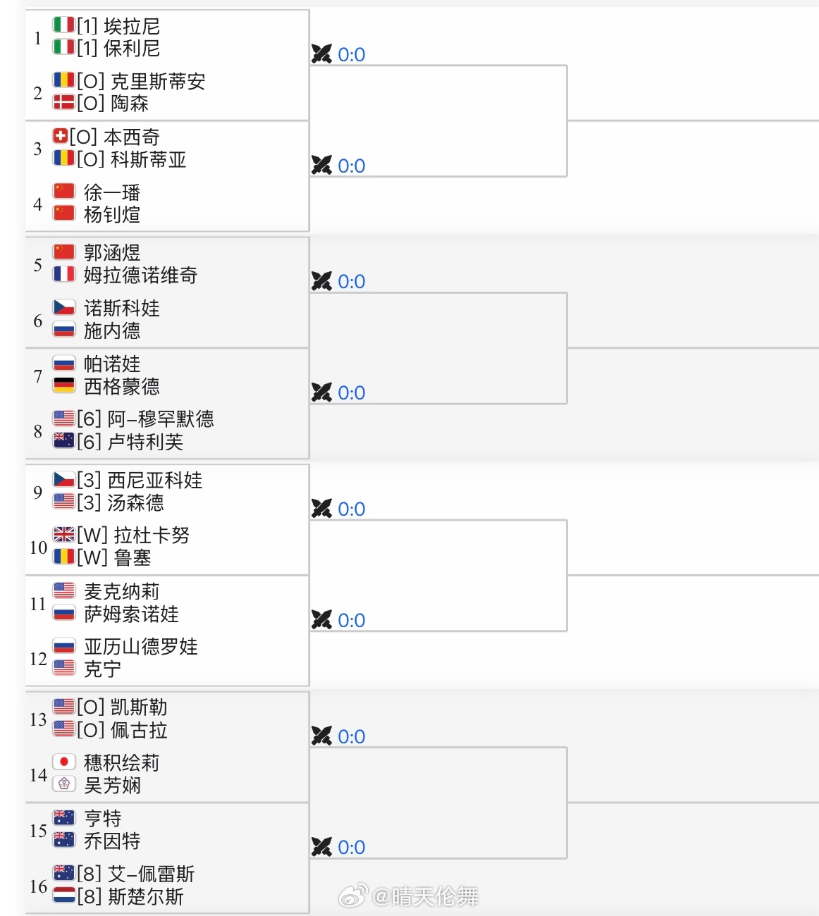 印第安维尔斯WTA1000双打签表张帅🇨🇳/梅尔滕斯🇧🇪 vs 安德列娃🇷🇺/姆博科🇨🇦郭涵煜🇨🇳/梅拉德诺维奇🇫🇷 vs 诺斯科娃🇨🇿/施内德🇷🇺徐一璠🇨🇳/杨钊煊🇨🇳 vs 本西奇🇨🇭/科斯蒂亚🇷🇴蒋欣玗🇨🇳/爱克里🇳🇴 vs 达布洛斯基🇨🇦/斯特凡尼🇧🇷中国网球