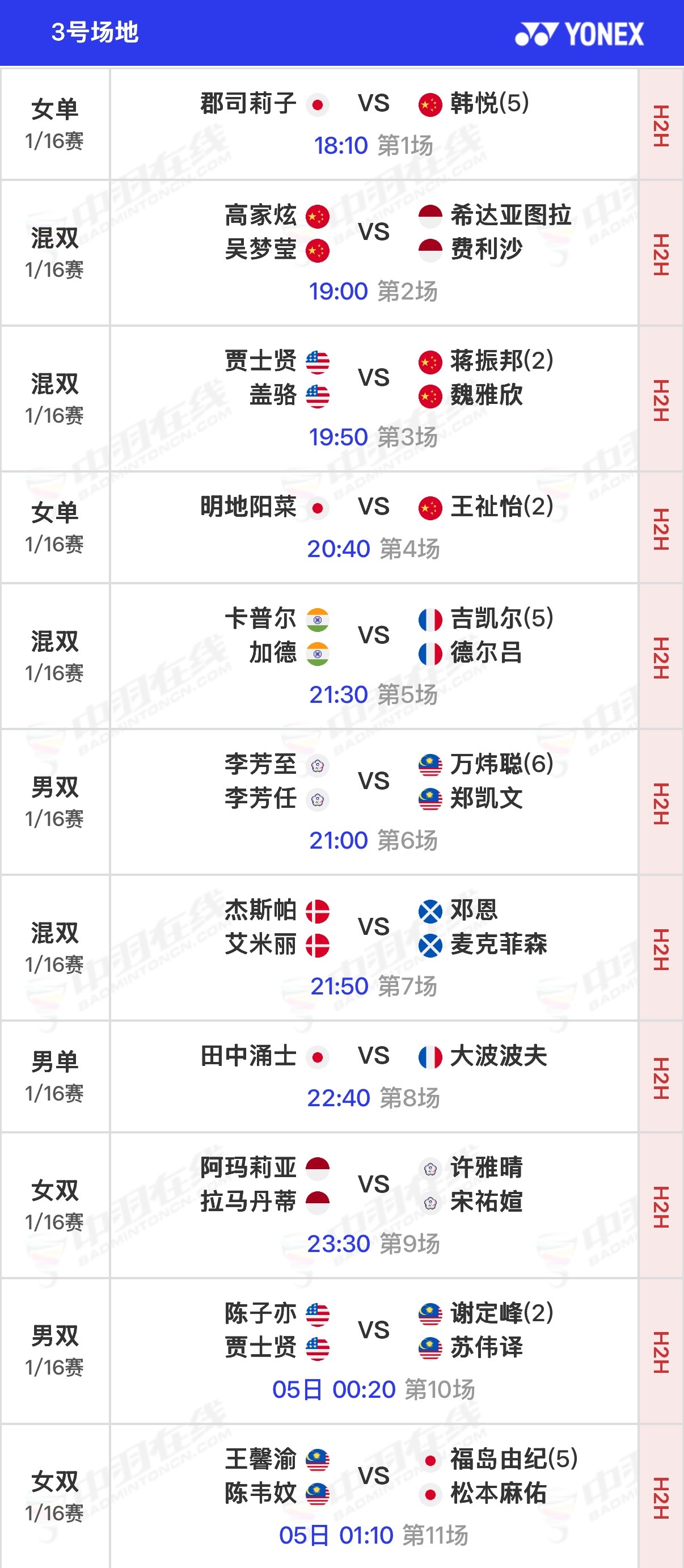 【三号场地】①🇨🇳韩悦vs郡司莉子🇯🇵②🇨🇳高家炫/吴梦莹vs希达亚图拉/费利沙🇮🇩③🇨🇳蒋振邦/魏雅欣vs贾士贤/盖骆🇺🇸④🇨🇳王祉怡vs明地阳菜🇯🇵