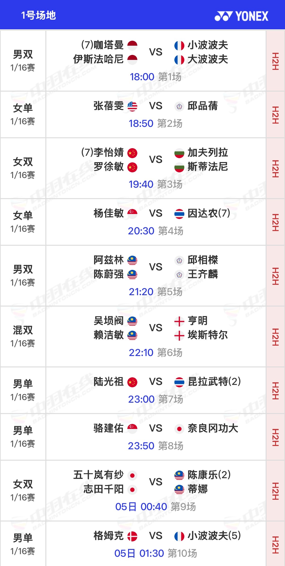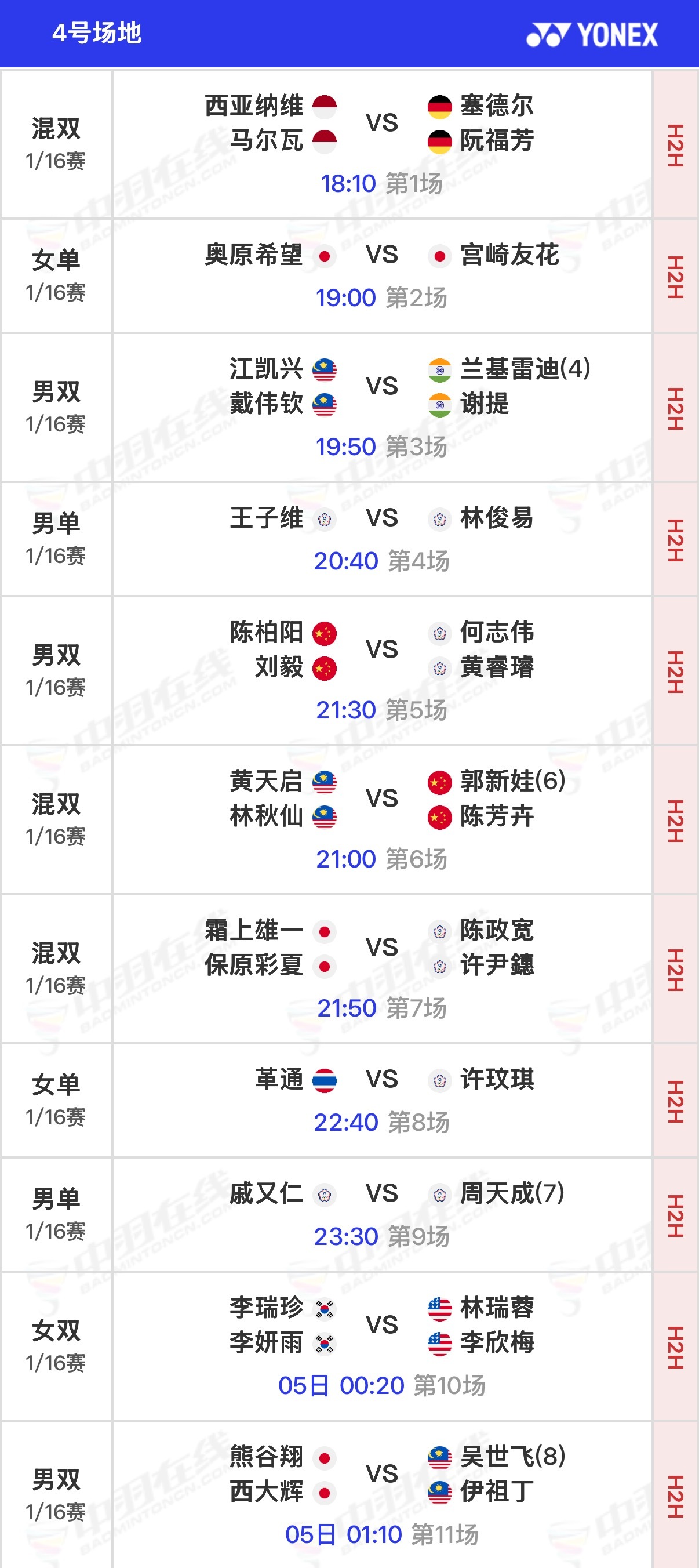 2026全英羽毛球公开赛 剩余1/16决赛北京时间18:00开始,可在羽协公众号/视频号、央视频、优酷观赛实时比分:网页链接官方赛程:网页链接