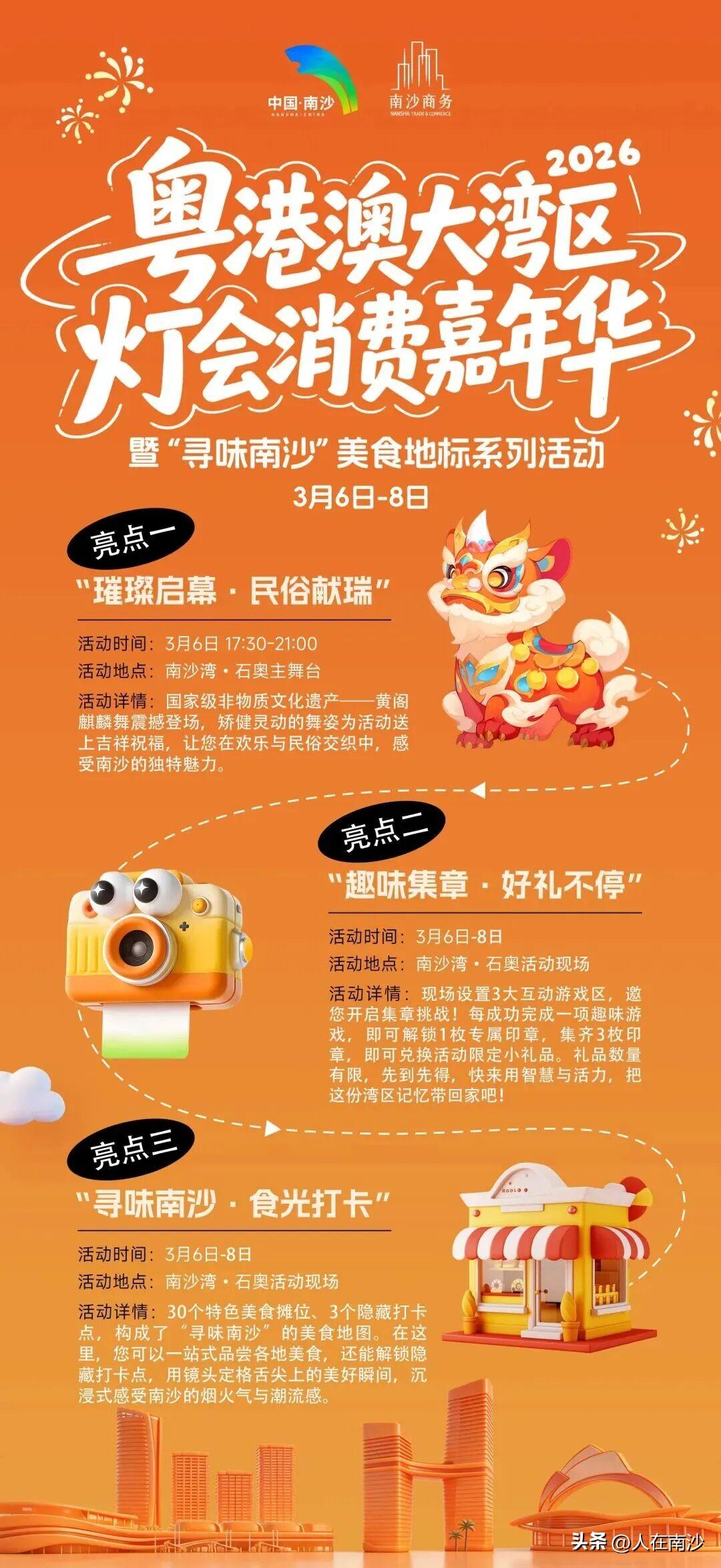 【南沙活动】南沙区2026年第一场消费盛宴——2026年粤港澳大湾区灯会消费嘉年华暨“寻味南沙”美食地标系列活动将在2026年3月6日-8日盛大启幕! 比较有趣的是,虽然说是灯会消费嘉年华,但是举办点并不是在灯会内,而是放在了南沙湾·石奥! 可以看到活动现场有国家级非物质文化遗产黄阁麒麟舞震撼登场,现场设置3大互动游戏区,每成功完成一项趣味游戏,即可解锁1枚专属印章,集齐3枚印章,即可兑换活动限定小礼品。当然少不了美食了。30个特色美食摊位、3个隐藏打卡星想成一式市各地表食地解新构成了"寻味南沙”的美食地图。